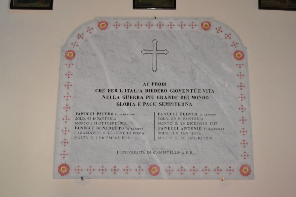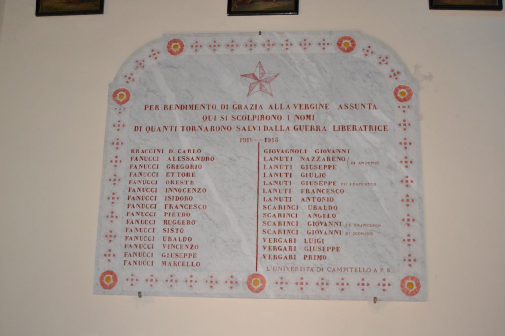 Due lastre rettangolari con incisione commemorativa, decorazione rossa a contorno e angoli in alto stondati, all’interno della chiesa di Santa Maria Assunta; la lastra sulla parete di destra commemora i Caduti di Campitello (PG) nella Grande guerra, quella sulla parete di sinistra ricorda chi è tornato salvo.