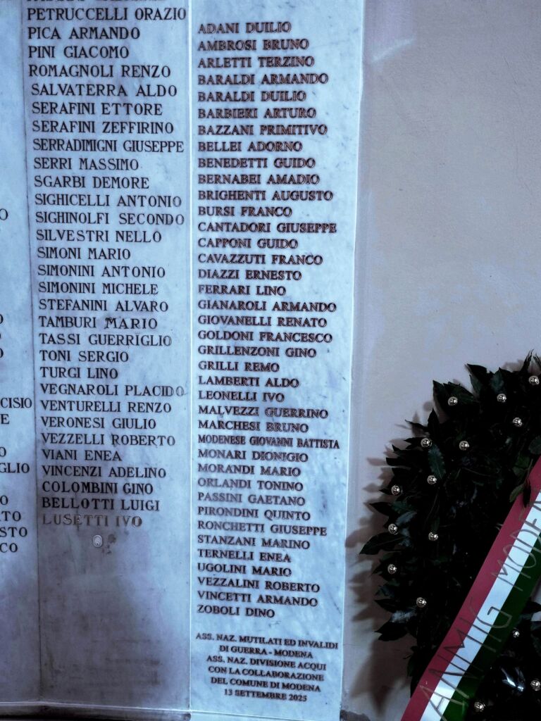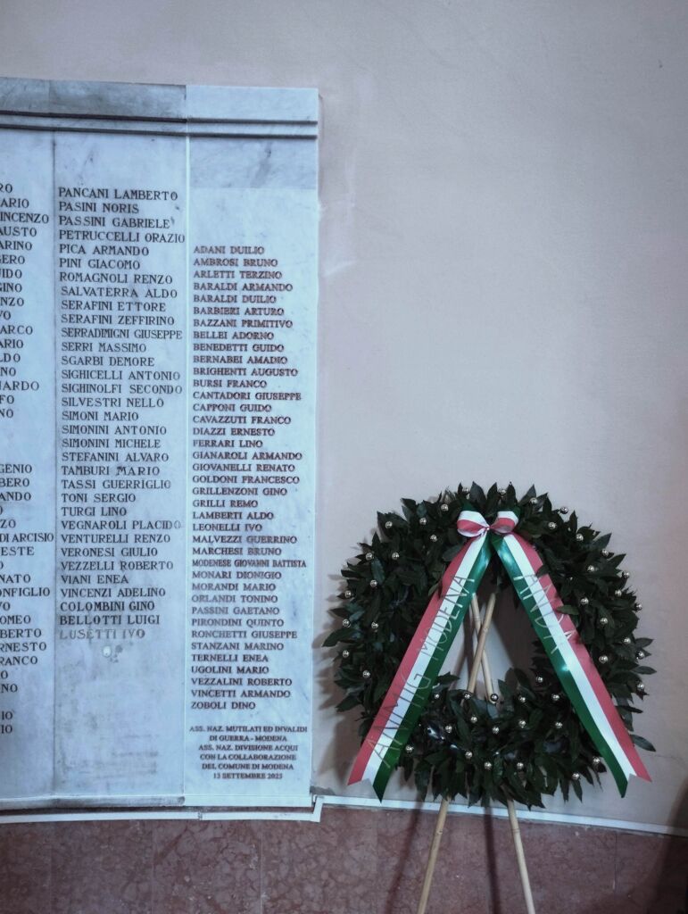 Nella mattinata del 13 settembre 2025 è stata inaugurata la nuova lapide con 39 nomi di modenesi caduti nel massacro della Divisione Acqui. I loro nominativi e le loro storie sono stati recuperati grazie alle nuove ricerche promosse da ANMIG Modena e condotte dallo storico Fabio Montella. I nuovi nomi si aggiungono ai 113 caduti già noti e celebrati da una prima lapide apposta nel Tempio.