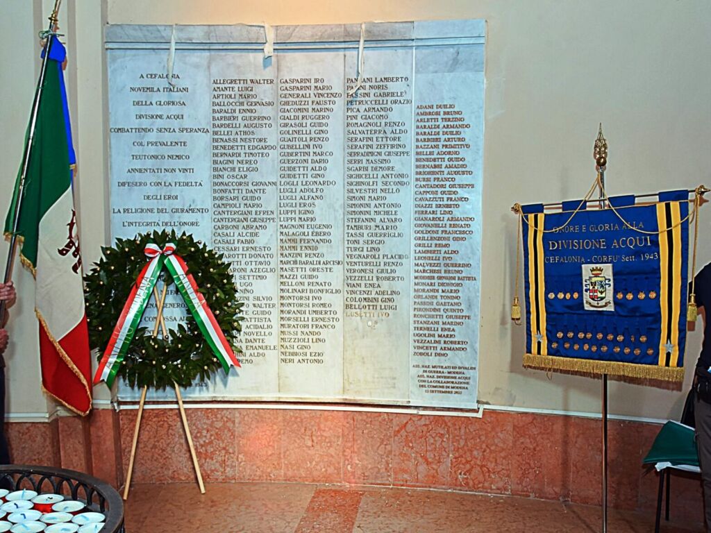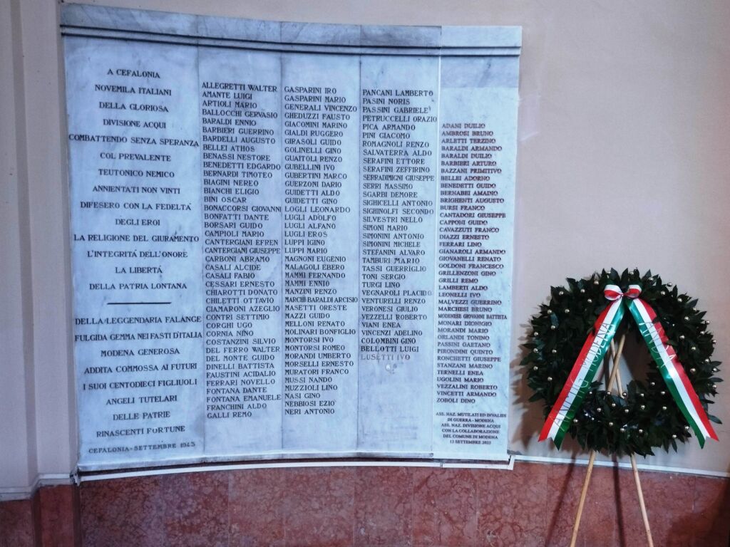 A Cefalonia/novemila italiani/della gloriosa/divisione Acqui/combattendo senza speranza/col prevalente/teutonico nemico/annientati non vinti/difesero con la fedeltà/degli eroi/la religione del giuramento/l'integrità dell'onore/la libertà/della patria lontana // Della leggendaria falange/fulgida gemma nei fasti d'Italia/Modena generosa/addita commossa ai futuri/i suoi centodieci figliuoli/angeli tutelari/delle patrie/rinascenti fortune/Cefalonia-settembre 1943.