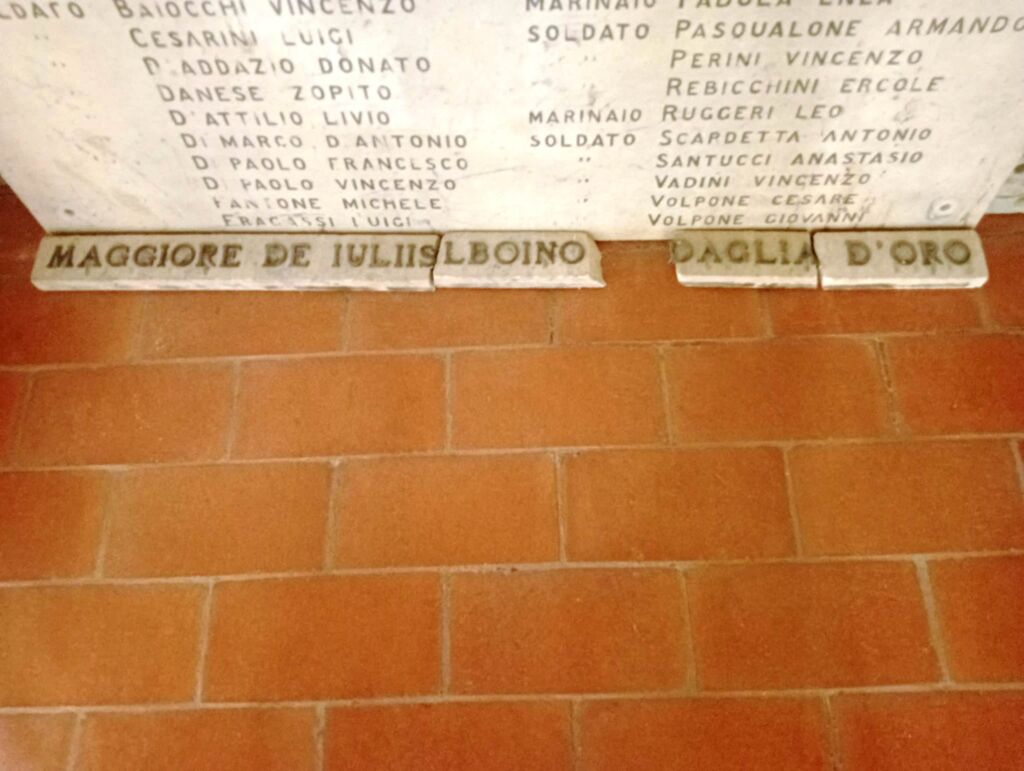 - Alboino De Iuliis nacque a Collecorvino nel 1893. Si arruolò nell’Esercito nel 1912. Allo scoppio della Grande Guerra era sergente maggiore. Nell’ottobre 1915 fu ferito sul Monte Vodil. A marzo 1917 fu nominato sottotenente. Tra le due guerre prestò servizio nelle Truppe coloniali della Cirenaica e nella Campagna d’Etiopia. Durante la seconda guerra mondiale fu richiamato come maggiore presso il deposito del 62° Reggimento fanteria "Sicilia" di Trento. All’annuncio dell’armistizio dell’8 settembre 1943 si recò al Deposito per organizzarne la difesa. Cadde combattendo contro i tedeschi il giorno successivo. Per la sua azione fu insignito della Medaglia d'Oro al Valor Militare con la seguente motivazione: “Alla notizia dell'armistizio dell'8 settembre 1943, accorreva prontamente alla caserma del Deposito. Ricevuti gli ordini, organizzava prontamente a difesa, con pochi uomini e con le poche armi e munizioni, un lato della stessa caserma contro probabili azioni dei tedeschi. Attaccato da forze ed armi superiori, rincuorava i propri dipendenti alla resistenza. Pur conscio della propria inferiorità, rispondeva col fuoco fino all'esaurimento delle munizioni. All'intimazione di resa, scaricava i colpi della sua pistola contro il nemico, finché cadeva colpito mortalmente e sul suo corpo già esanime si sfogava l'ira dello avversario con nuove scariche di mitragliatore. Puro esempio di alte doti militari e sentimento del dovere. Fedele al giuramento immolava la sua vita alla Patria. Trento - Caserma Cesare Battisti, 9 settembre 1943.”