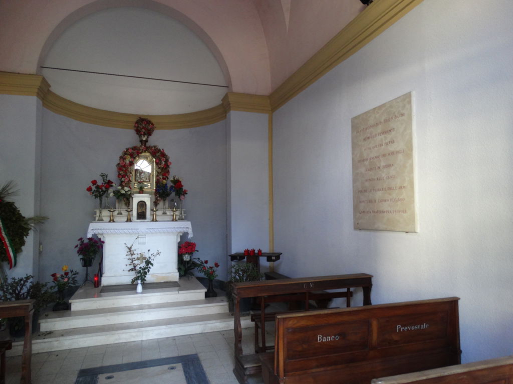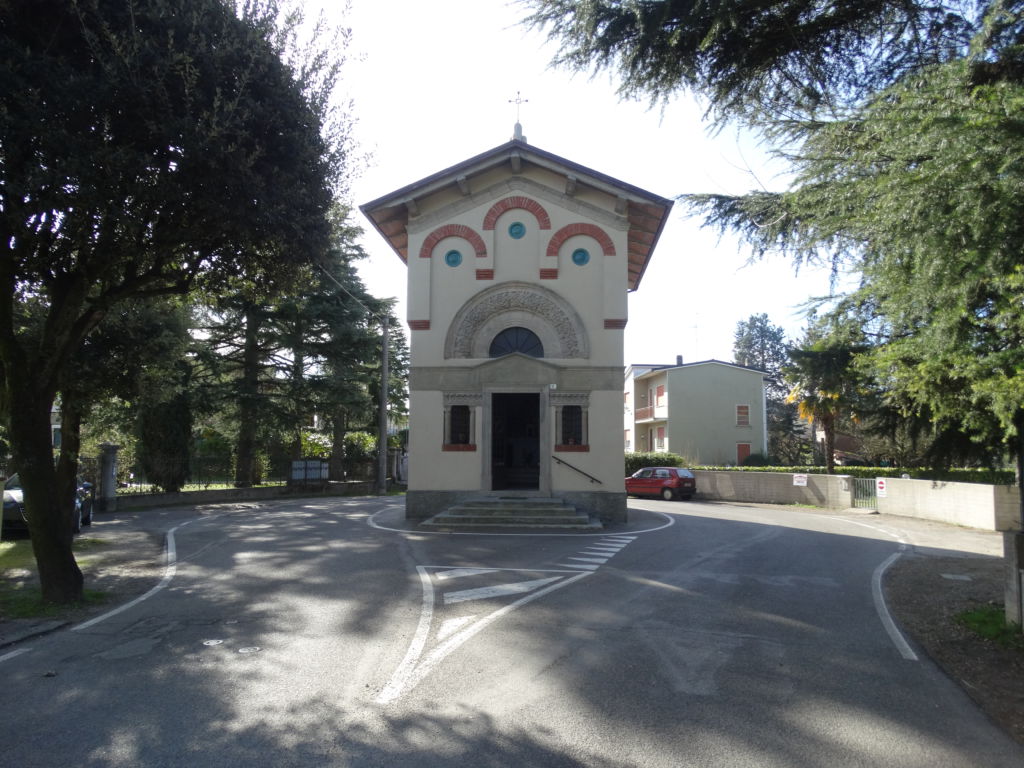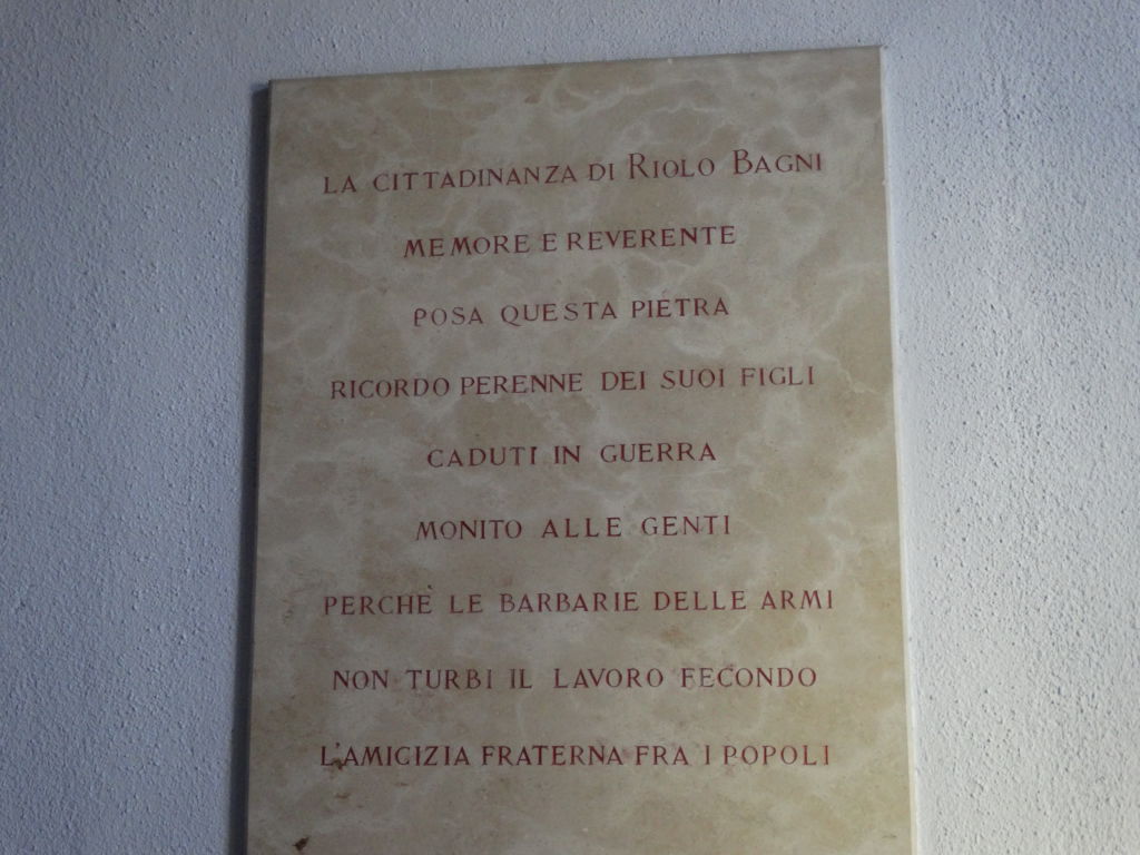 - Nel periodo in cui in altre città d'Italia si realizzavano parchi delle rimembranze ponendo a riposo alberi destinati ad ombreggiare in eterno le lapidi dei caduti nella prima guerra mondiale, a Riolo Terme fu edificata questa chiesetta che ricorda tutti i caduti riolesi ed è di monito ai posteri. Nel tempo, ma in data imprecisata, sono state poste all'interno le due lapidi delle cui iscrizioni si dà conto più sotto.