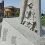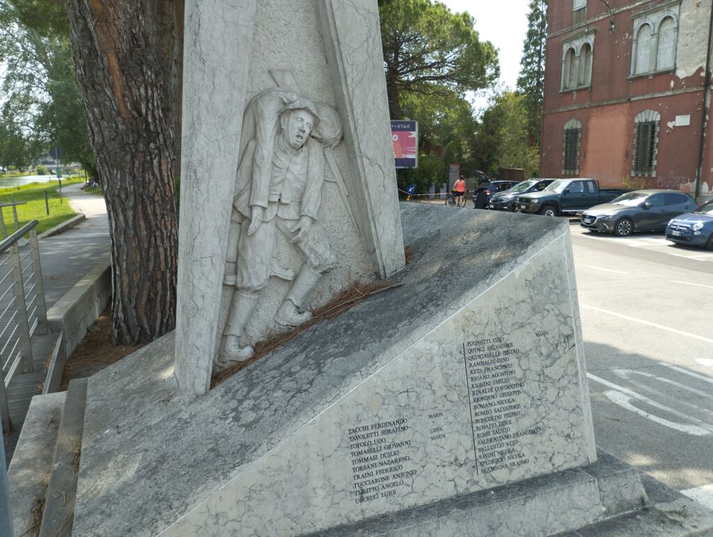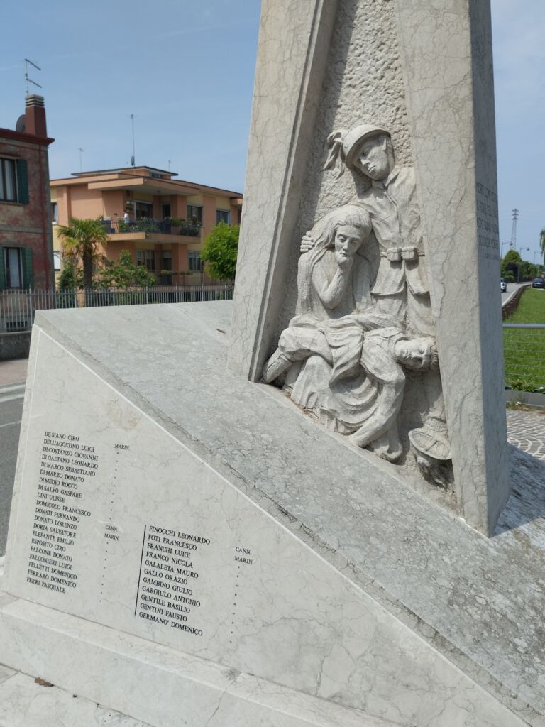 - nell’obelisco di sinistra essa raffigura un soldato privo di vita in grembo ad una donna piangente, avvolta in una lunga veste. Dietro la figura femminile c’è un altro soldato che le cinge le spalle in un atto consolatorio;