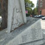 - nell’obelisco di destra essa raffigura un soldato che trasporta con fatica e dolore il corpo esamine di un commilitone che ha ancora il fucile in spalla.
