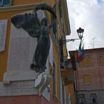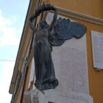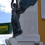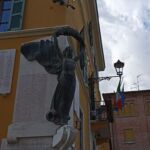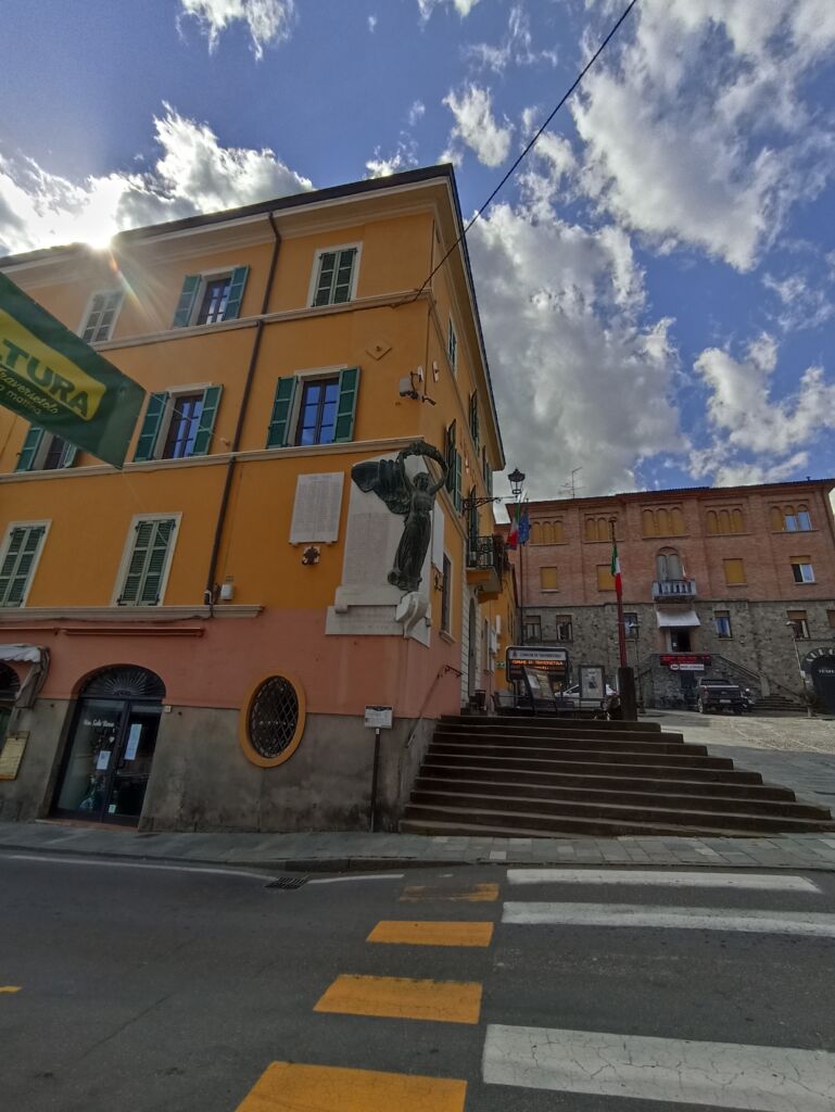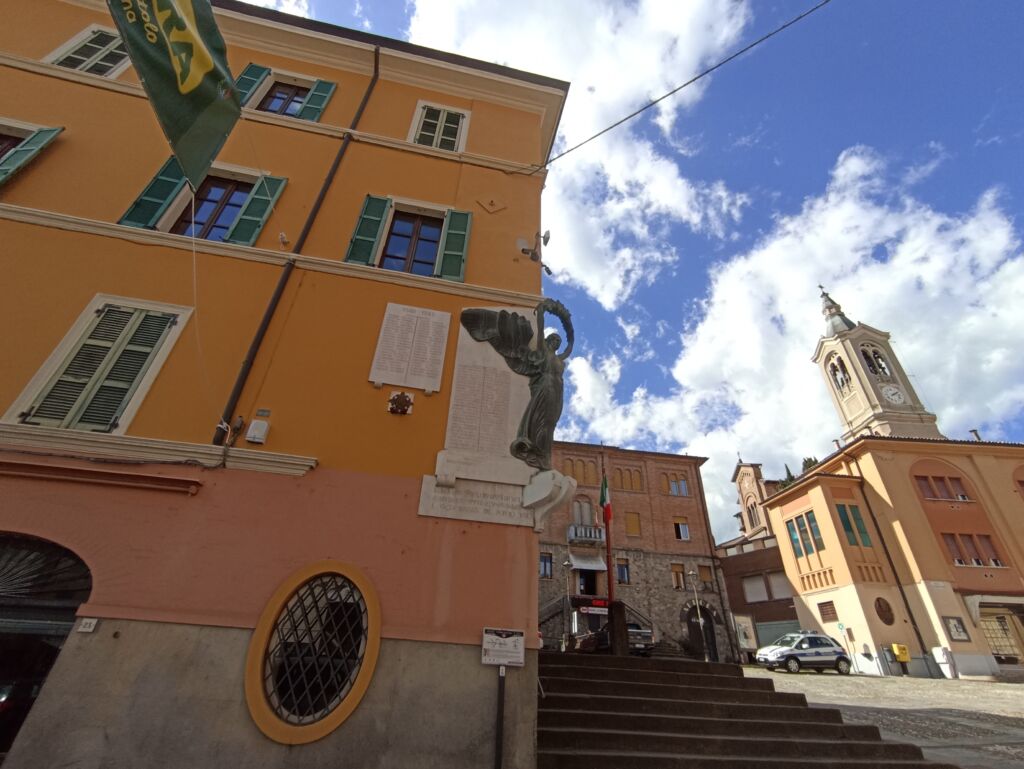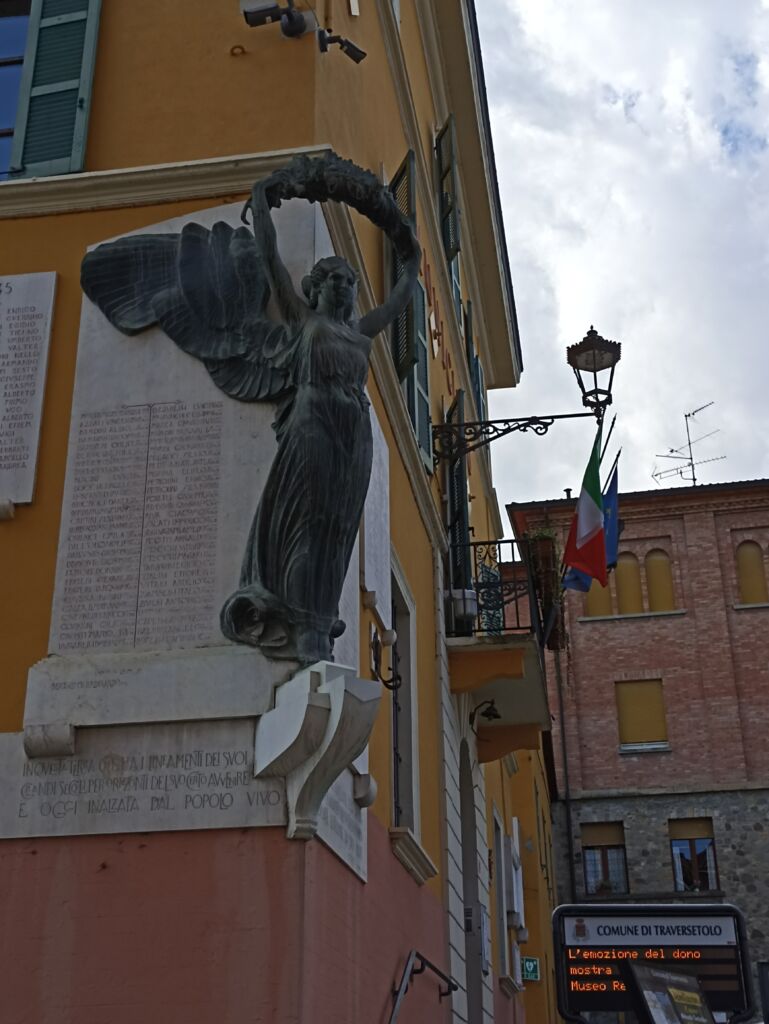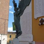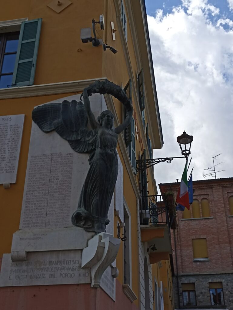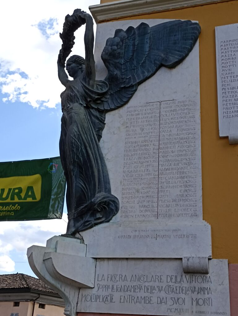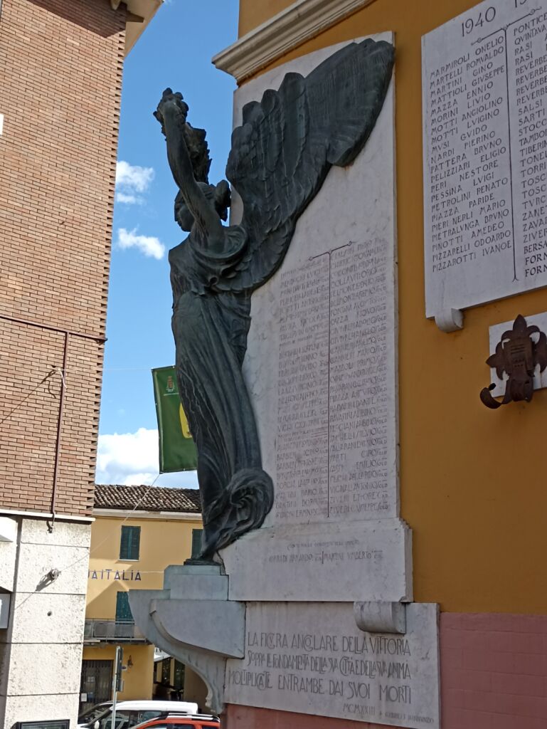 Il monumento a parete, in posizione angolare, ricorda i Caduti della prima guerra mondiale. La scultura rappresenta una figura con le ali dispiegate nell’atto di portare in alto una corona di alloro e poggia su una mensola inserita sull’angolo dell’edificio sede municipale. Su entrambi i lati delle lapidi in marmo riportano incisi nomi e  frasi dedicatorie.