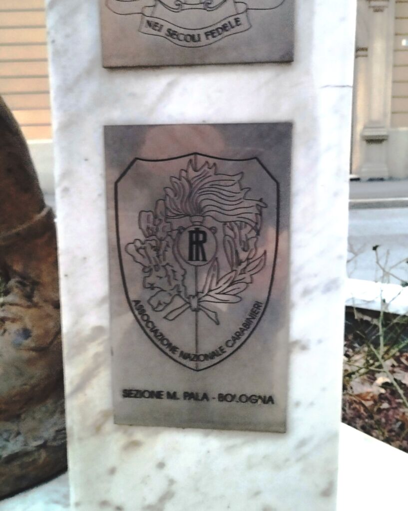 La statua è posta in un giardinetto semicircolare, delimitato da un’aiuola formata da un basso muretto rivestito di lastre di marmo bianco. Al centro dell’aiuola è posto un basamento di marmo bianco su cui poggia la raffigurazione dell’eroe in divisa da carabiniere con la mano destra posta sul petto e quella sinistra appoggiata a una balaustra. Su un lato di questa sono agganciati dall’alto verso il basso: la Fiamma dei Carabinieri, lo Stemma Araldico dei Carabinieri, lo Stemma della sezione M. Pala di Bologna dell’A.N.C. (Associazione Nazionale Carabinieri). A terra davanti alla balaustra è posto il cappello dell’eroe.