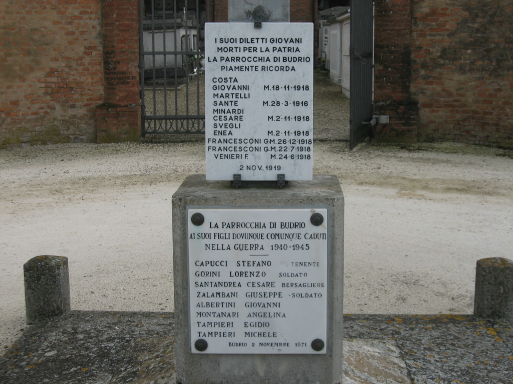 Budrio è una frazione piccolissima tra Cotignola e Barbiano, nella campagna a sud di Lugo di Romagna. 7 sono i suoi abitanti caduti nella Grande Guerra: dalla data della morte si intuisce che alcuni morirono dopo la fine della guerra, sicuramente a causa delle ferite riportate in combattimento o per malattia. Nell’elenco della seconda guerra sono tutte accumunate insieme 8 persone: 4 sono militari, di cui è specificato solo il grado, e tra i civili spicca il nome di una donna, a testimonianza del passaggio del fronte proprio tra le case di questo borgo di campagna. Il Comune di Cotignola fece costruire il monumento, poi si accorse di avere sbagliato le misure e lo voleva demolire, ma Don Luigi Berardi, il parroco di Budrio, raccolse le firme degli abitanti della piccola frazione e tutti insieme gli abitanti del luogo sono riusciti a conservarlo intatto, a memoria dei posteri.