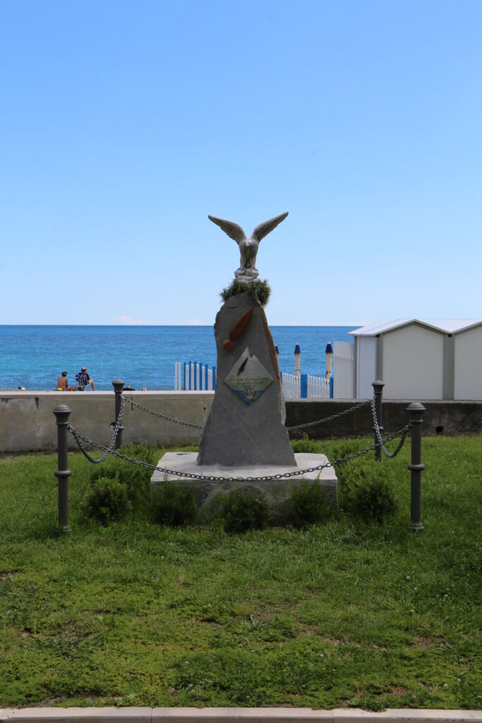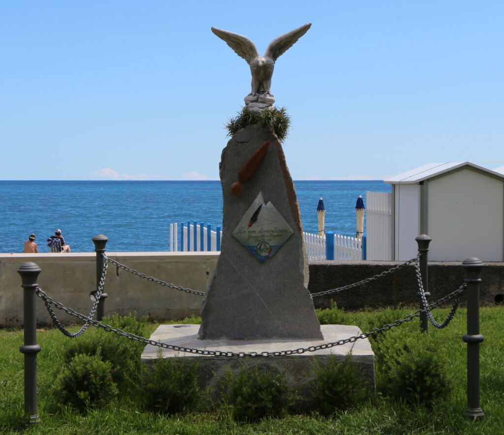 - Pietra in arenaria granitica proveniente dalla Cava di Verezzo Sas degli eredi di Silvestro Silvestri, basamento in cemento rivestito con pietra di Luserna, aquila in pietra ricostituita, targa in ceramica, penna alpina in legno.