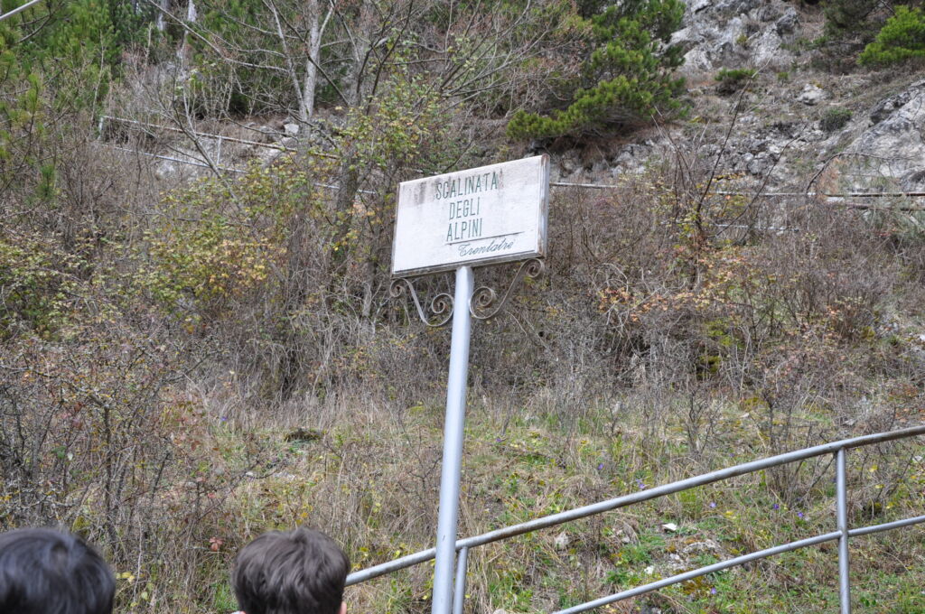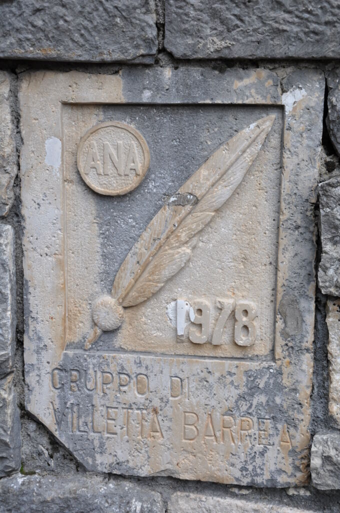 Sulla piccola lastra, scolpita nella parete retrostante l'altare, è presente una "penna nera" tipico simbolo degli alpini.