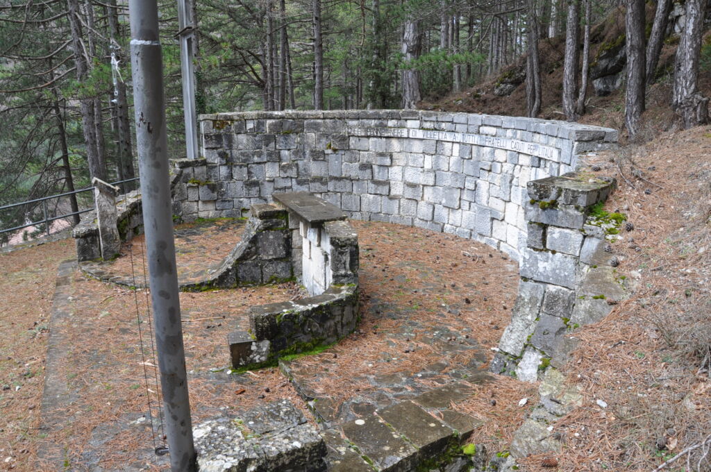 Altare, pavimento e muro perimetrale in pietra locale. Croce stilizzata in ferro battuto. Pennone alzabandiera in acciaio. Cannone in bronzo.