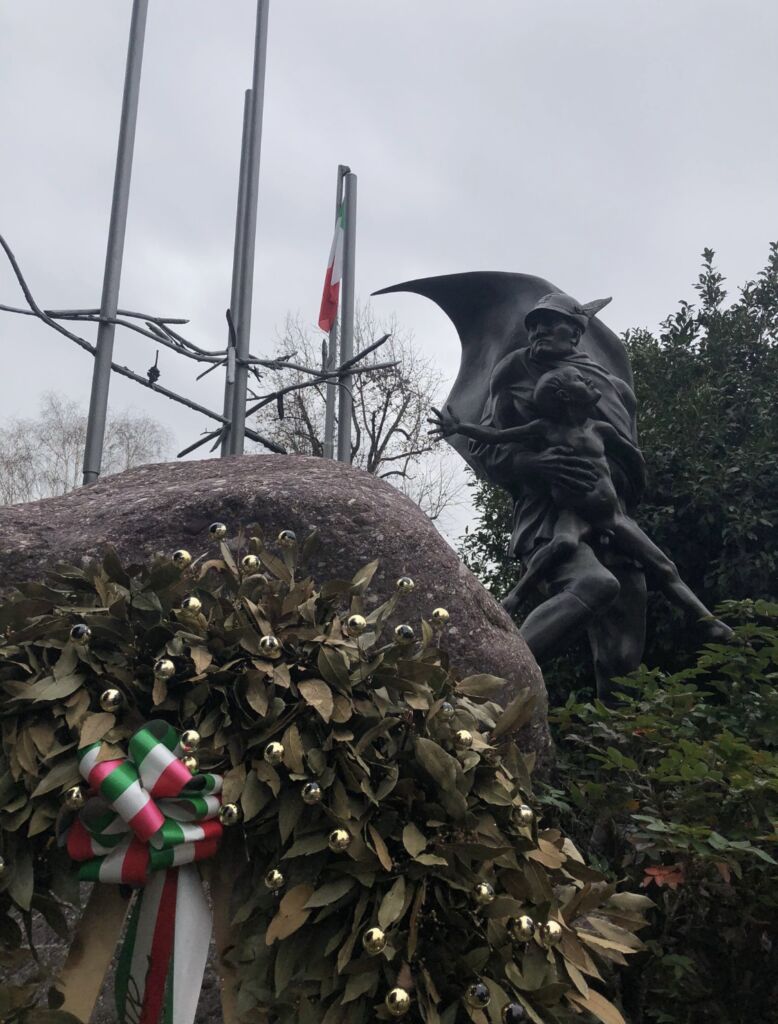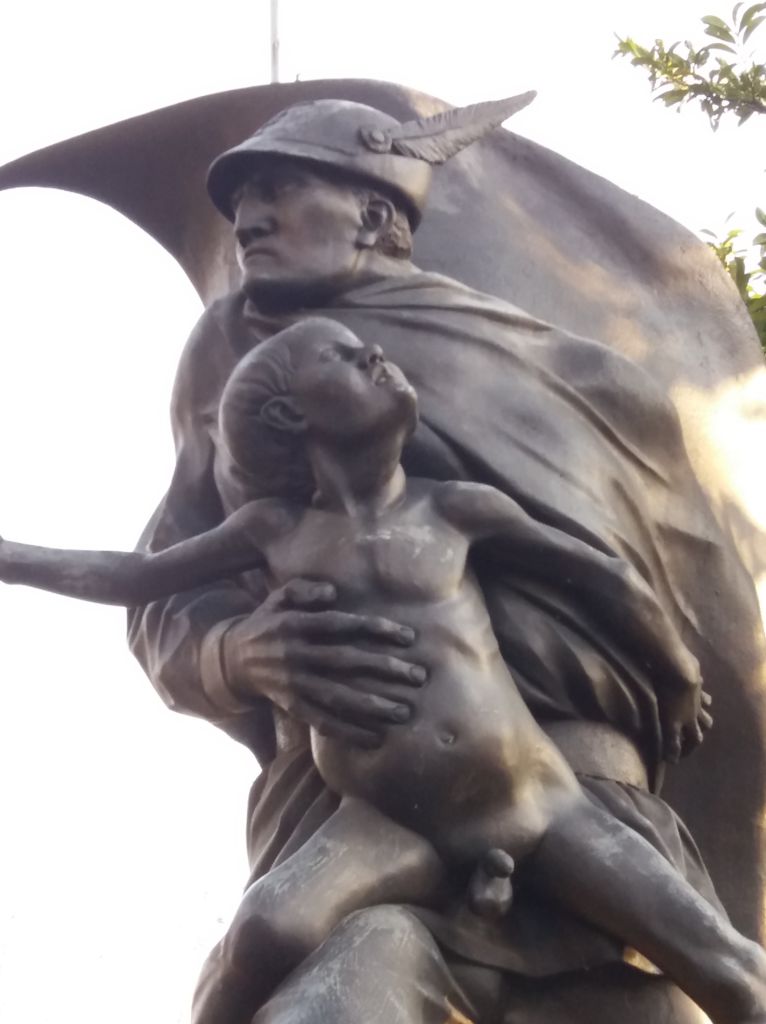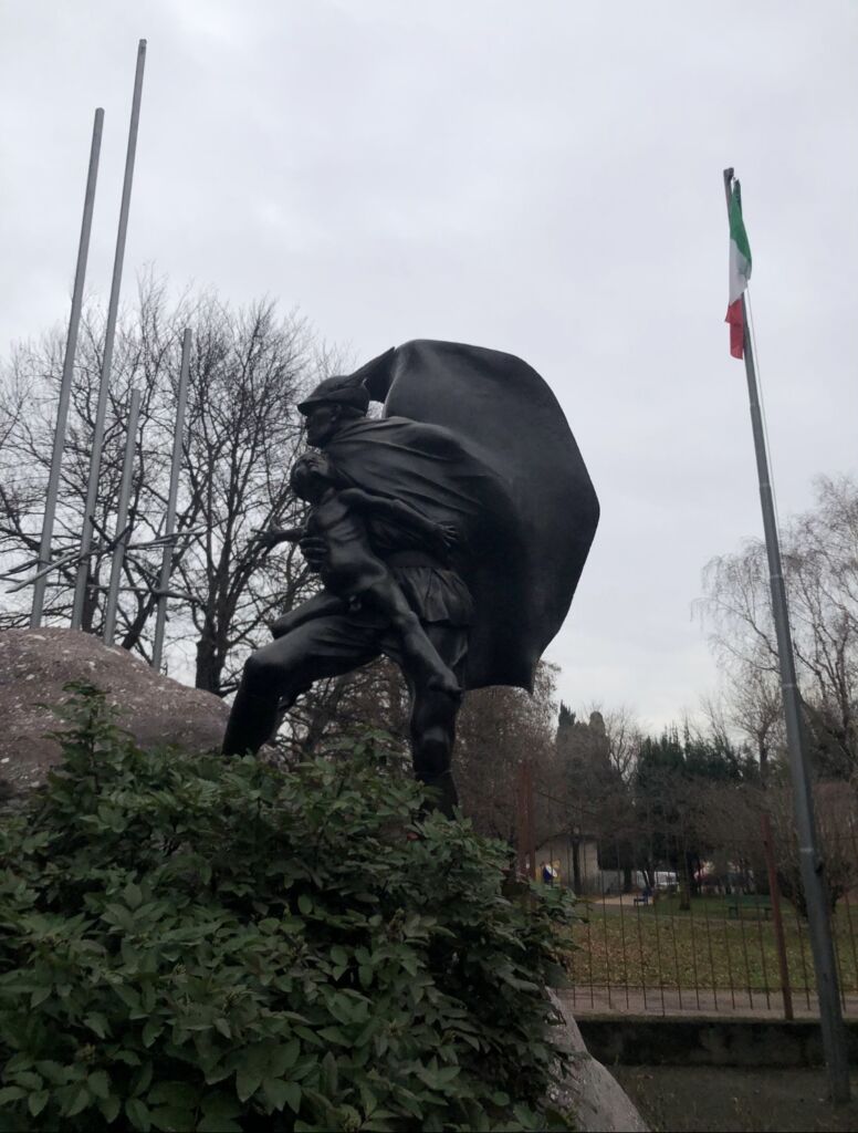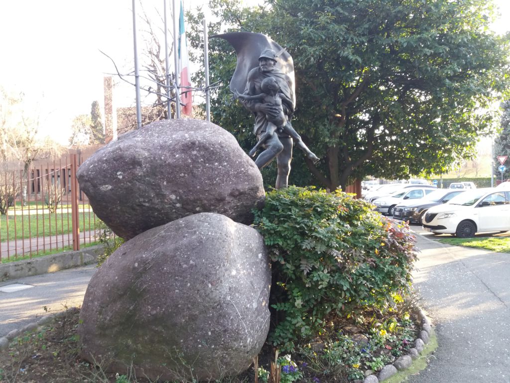 Questo monumento è costituito da un gruppo di rocce utilizzate come basamento, sulle quali è stata posta una statua in bronzo che raffigura un alpino intento nell’atto di salvare un bambino. Il bambino si trova in braccio all’uomo, con le braccia spalancate, come se si stesse affidando completamente al suo salvatore. Il bimbo è molto magro, causa le carestie che sono state portate dalle due grandi guerre, si intravedono le costole. L’uomo è chiaramente un alpino poiché indossa il tipico vestiario e porta sul capo il cappello caratteristico, l’identità è però ignota: rappresenta simbolicamente il corpo degli alpini che combatterono valorosamente nella Prima e Seconda guerra mondiale. Accanto alla statua è posata una ghirlanda ornata dal tricolore italiano.