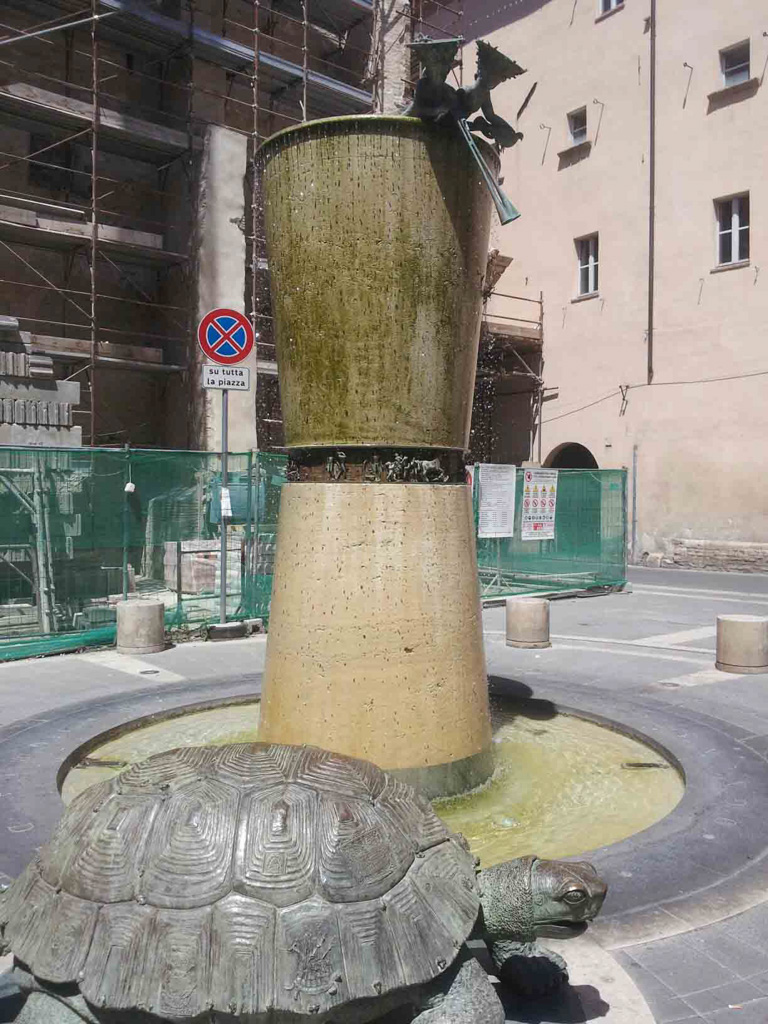 Monumento/fontana commemorativo agli eroi folignati. La fontana, posta al centro della piazza, si presenta con in cima degli angeli che suonano uno strumento a fiato.