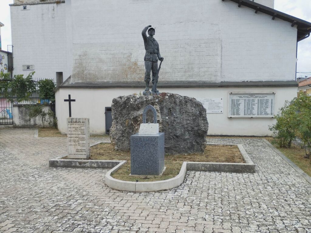 Il monumento ai 72 aiellesi caduti in varie guerre è formato dalla statua di un Alpino, posto su una roccia mentre scruta l’orizzonte, e da alcune lastre dedicatorie e con i nomi dei Caduti. La lastra più grande riporta l’elenco completo dei nomi dei caduti in tutte le guerre mentre la lastra più piccola riporta i nomi dei caduti della Grande Guerra mancanti nella lapide posta sulla facciata della Chiesa parrocchiale. A terra a sinistra dell’Alpino si trova un cippo di pietra su cui è riportata una poesia di Ungaretti. Sulla parete una terza lastra riporta nomi di aiellesi morti a causa del terribile terremoto che colpì il Fucino e la Marsica il 13 gennaio 1915.