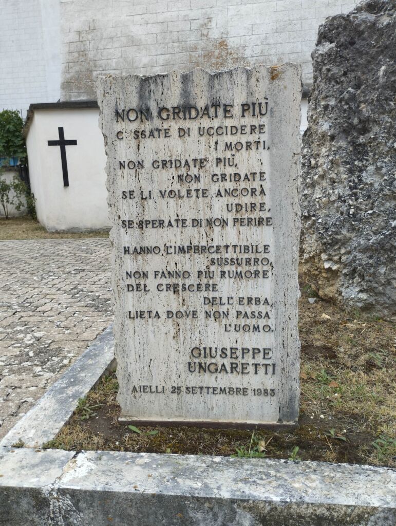 Ai piedi del Monumento furono tumulate il 25 ottobre 2017 le spoglie del soldato aiellese Mario Marco Angeloni riportate in patria dopo 72 anni dalla morte. Angeloni, nato a Aielli il 3 dicembre 1921, fu soldato della 65^ Sezione Sanità durante la seconda guerra mondiale. Dopo l’armistizio dell’8 settembre 1943, fu catturato dai tedeschi e deportato in Germania, dove morì il 13 maggio 1945. Fu quindi tumulato nel Cimitero Militare Italiano d'Onore di Francoforte fino alla sua traslazione.