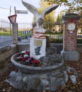 - Il monumento è costituito da un’aquila in pietra con le ali spiegate che poggia su un basamento di cemento intonacato, pietre e mattoni. Sul fronte del basamento a forma di parallelepipedo è agganciata una lastra di ottone con incisa la dedica. Il tutto è posto sopra un’aiuola a forma di vasca con un basamento di pietre.