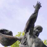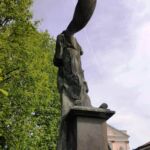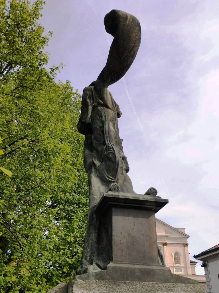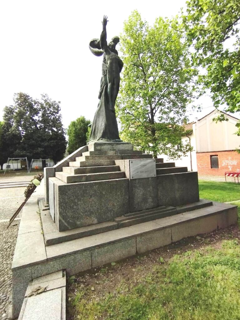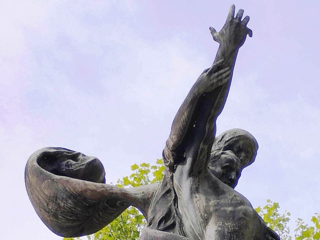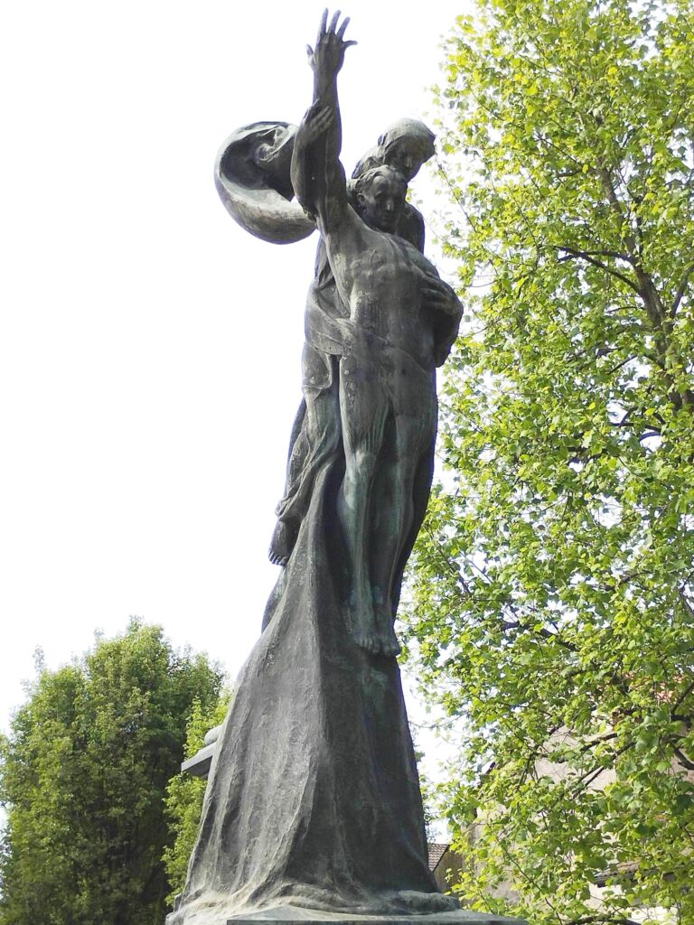 - La statua monumentale rappresenta un soldato nudo morente che viene sorretto da una donna che lo avvolge con il proprio mantello e lo innalza al di sopra di un’ara votiva posta alle loro spalle.