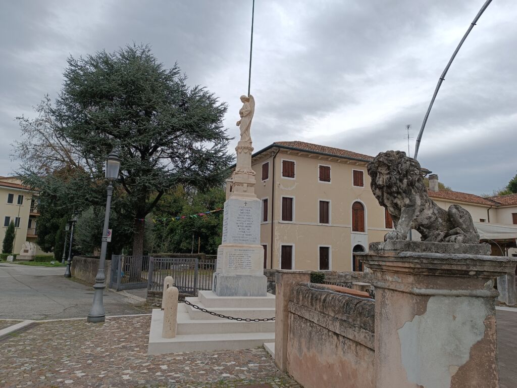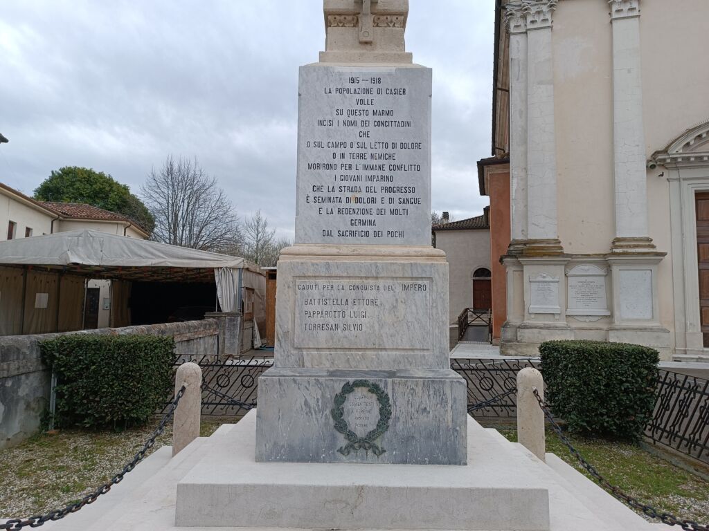 Monumento di medie dimensioni con elementi architettonici e un elemento scultoreo, in ricordo dei Caduti della prima guerra mondiale e dei Caduti e dei Dispersi della seconda guerra mondiale del Comune di Casier. Il monumento riporta una lista di 34 Caduti, di una persona colpita da granata nemica in Casier durante la Grande Guerra, di 3 caduti nella conquista dell’Impero, di 5 Dispersi e di 8 Caduti durante la seconda guerra mondiale. Lateralmente è presente il pennone per l’alzabandiera.