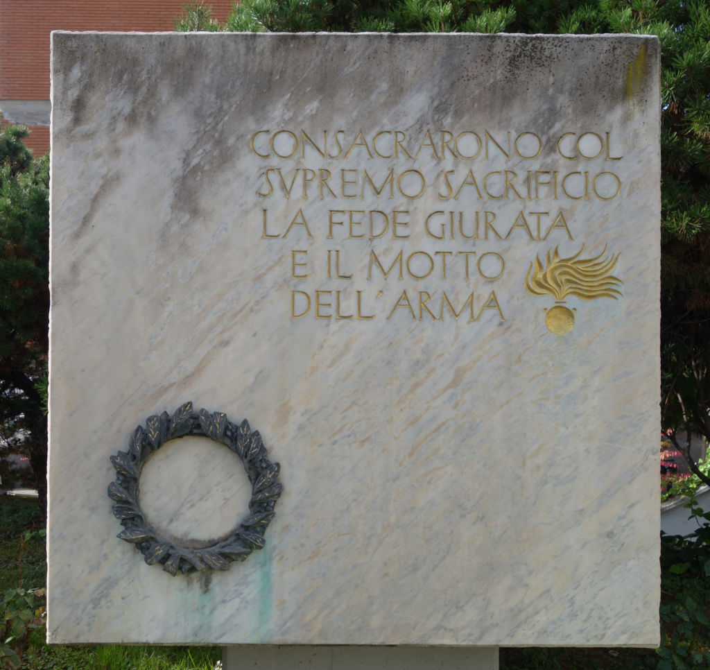 Opera che, posta in un decoroso alveo caratterizzato dal verde, richiama, con vigore e umano coinvolgimento di sentimenti, le virtù e i sacrifici dei molti Carabinieri che si sono nel tempo immolati nell’adempimento del loro dovere, divenendo, per le più giovani generazioni, fulgido esempio da emulare.
