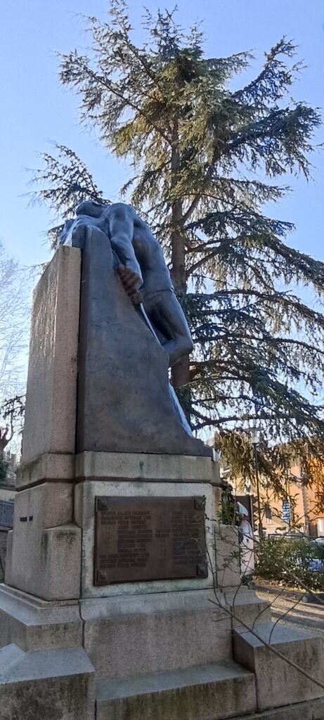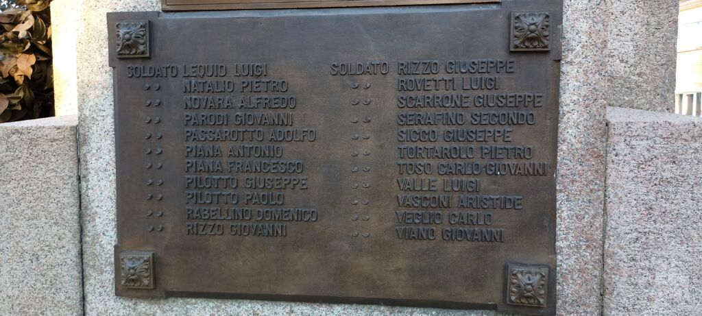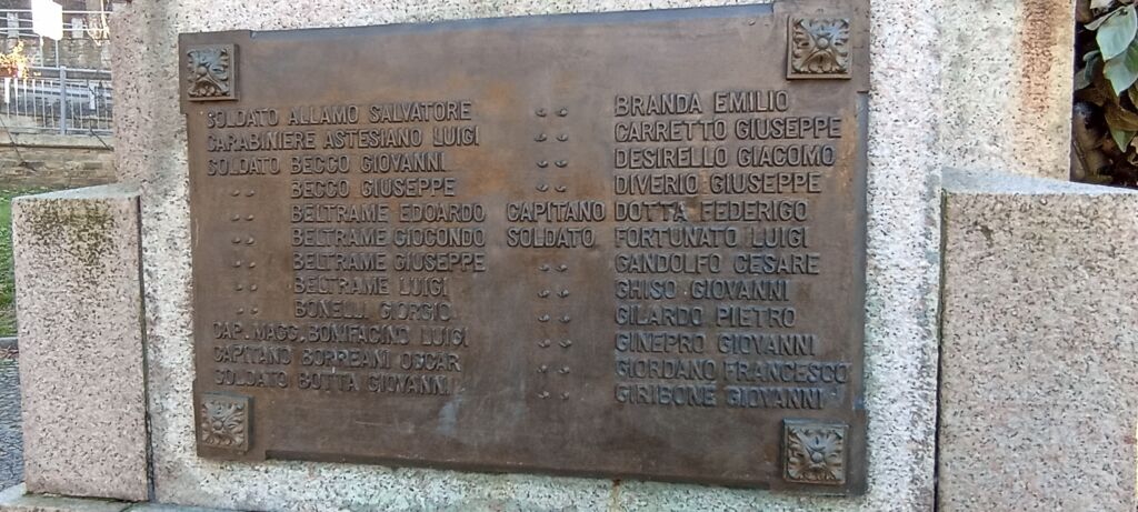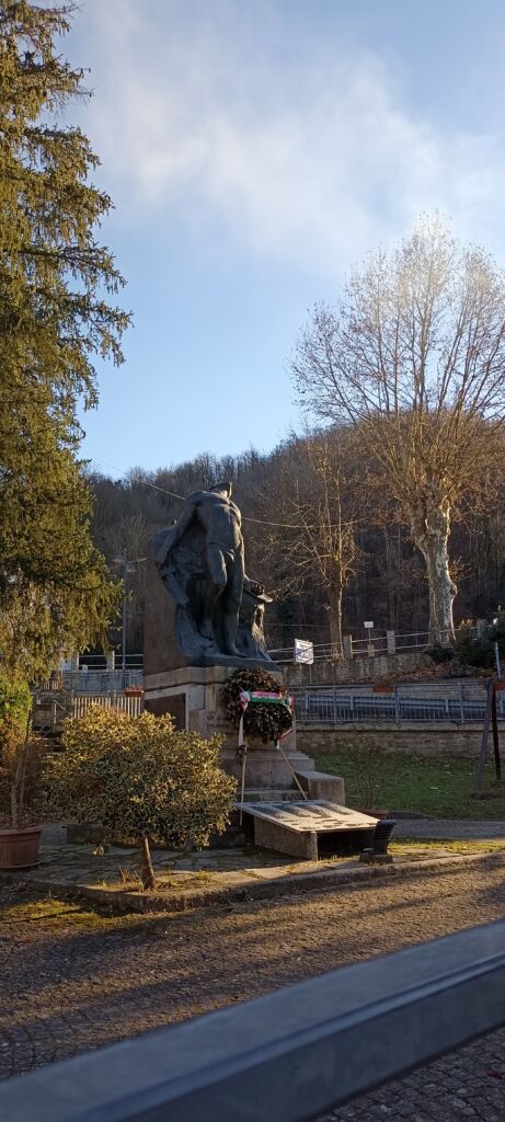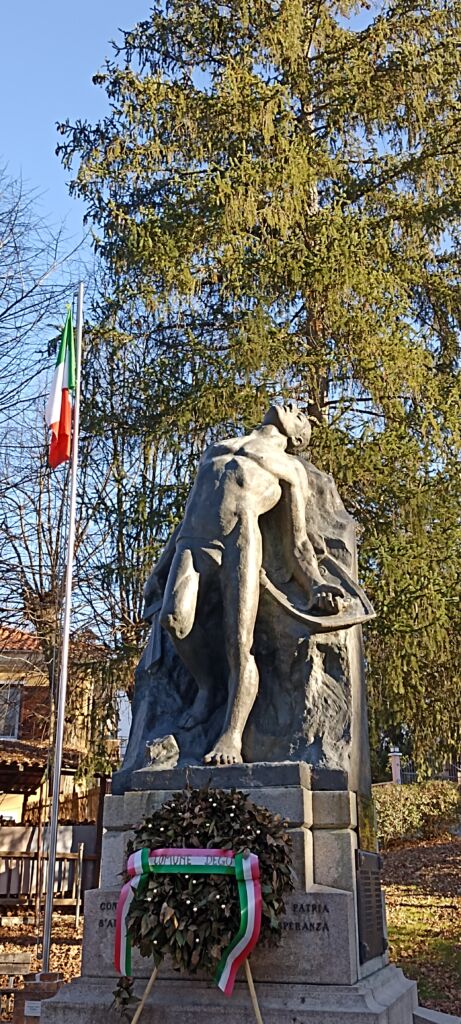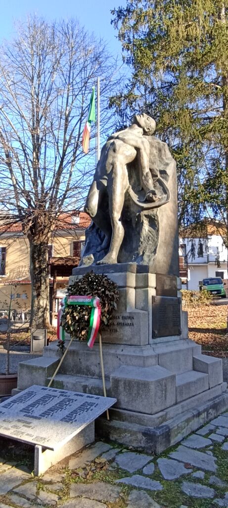 Il monumento, collocato nei giardini pubblici all’ingresso del paese, si compone di un piedistallo su un basamento a gradoni a pianta quadrata, e di una statua in bronzo appoggiata ad un elemento verticale sempre in granito. E’ rappresentato un corpo maschile nudo appoggiato a una roccia con in mano armi antiche (uno scudo ed una spada), simbolo dell’eroismo e del sacrificio del soldato per la patria. Sui fronti laterali sono state affisse lastre commemorative.