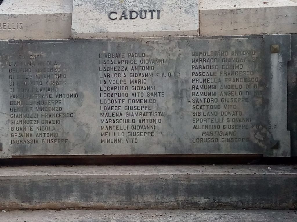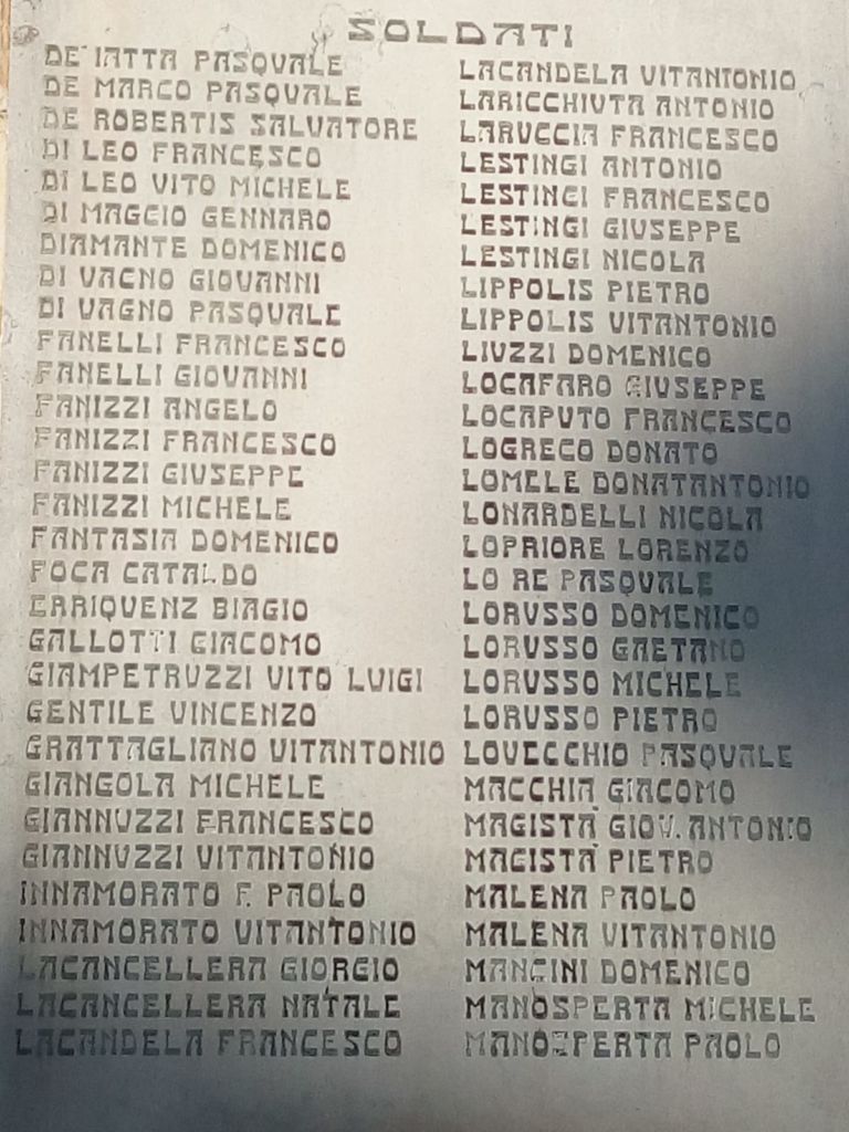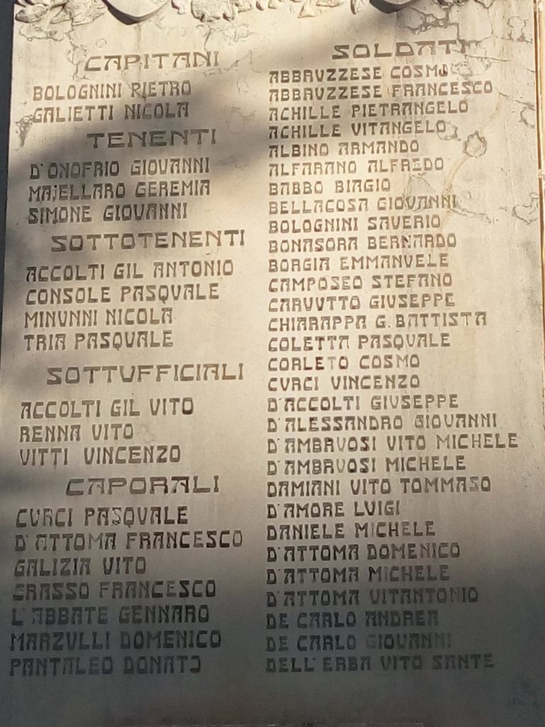 ABBRUZZESE COSMO, ABBRUZZESE FRANCESCO, ACHILLE PIETRANGELO, ACHILLE VITANGELO, ALBINO ARMANDO, ALFARANO ALFREDO, BABBO BIAGIO, BELLACOSA GIOVANNI, BOLOGNINI SAVERIO, BONASORA BERNARDO, BORGIA EMMANUELE, CAMPOSEO STEFANO, CARVUTTO GIUSEPPE, CHIARAPPA G. BATTISTA, COLETTA PASQUALE, CORLETO COSMO, CURCI VINCENZO, D'ACCOLTI GIUSEPPE, D'ALESSANDRO GIOVANNI, D'AMBRUOSI MICHELE, DAMIANI VITO TOMMASO, D'AMORE LUIGI, DANIELE MICHELE, D'ATTOMA DOMENICO, D'ATTOMA MICHELE, D'ATTOMA VITANTONIO, DE CARLO ANDREA, DE CARLO GIOVANNI, DELL'ERBA VITO SANTE.