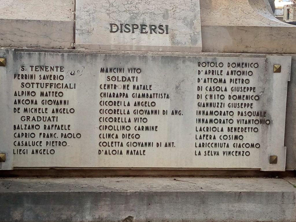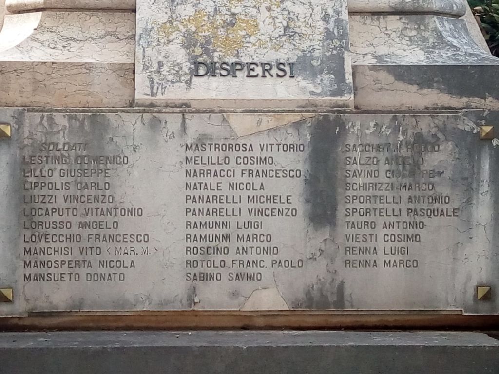 D'ATTOMA NICOLA, DELFINO VINCENZO, DI……. VITANTONIO, DI LEO VITO (1887), DI TURI FLAVIANO, FANELLI FRANCESCO ANTONIO, GENTILE GIUSEPPE, GENTILE VINCENZO, GIANNUZZI FRANCESCO, GIANNUZZI GRAZIO, GIGANTE NICOLA, GRAVINA ANTONIO, INGRASSIA GIUSEPPE, L'ABBATE PAOLO, LACALAPRICE GIOVANNI, LAGHEZZA ANTONIO, LARUCCIA ANTONIO (A.O.I.), LA VOLPE MARIO, LOCAPUTO GIOVANNI, LOCAPUTO VITO SANTE, LOCONTE DOMENICO, LOVECE GIUSEPPE, MALENA GIAMBATTISTA, MARASCIULO ANTONIO, MARTELLI GIOVANNI, MELILLO GIUSEPPE, MINUNNI VITO, NAPOLETANO ANTONIO, NARRACCI GIAMBATTISTA, PARADISO COSIMO, PASCALE FRANCESCO, PRUNELLA FRANCESCO, RAMUNNI ANGELO DI GIUSEPPE, RAMUNNI ANGELO DI NICOLA,