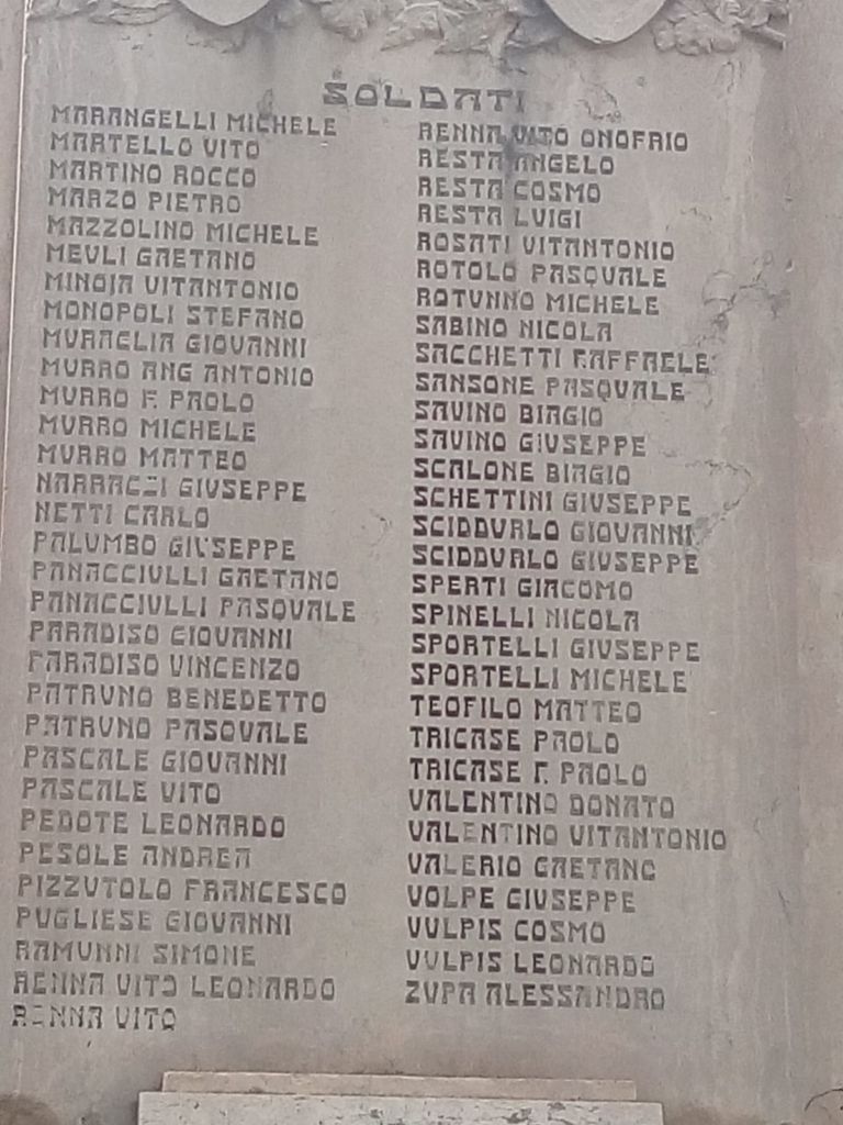 MARANGELLI MICHELE, MARTELLO VITO, MARTINO ROCCO, MARZO PIETRO, MAZZOLINO MICHELE, MEULI GAETANO, MINOIA VITANTONIO, MONOPOLI STEFANO, MURAGLIA GIOVANNI, MURRO ANG. ANTONIO, MURRO F. PAOLO, MURRO MICHELE, MURRO MATTEO, NARRACCI GIUSEPPE, NETTI CARLO, PALUMBO GIUSEPPE, PANACCIULLI GAETANO, PANACCIULLI PASQUALE, PARADISO GIOVANNI, PARADISO VINCENZO, PATRUNO BENEDETTO, PATRUNO PASQUALE, PASCALE GIOVANNI, ASCALE VITO, PEDOTE LEONARDO, PESOLE ANDREA, PIZZUTOLO FRANCESCO, PUGLIESE GIOVANNI, RAMUNNI SIMONE, RENNA VITO LEONARDO, RENNA VITO, RENNA VITO ONOFRIO, RESTA ANGELO, RESTA COSMO, RESTA LUIGI, ROSATI VITANTONIO, ROTOLO PASQUALE ROTUNNO MICHELE, SABINO NICOLA, SACCHETTI RAFFAELE, SANSONE PASQUALE, SAVINO BIAGIO, SAVINO GIUSEPPE, SCALONE BIAGIO, SCHETTINI GIUSEPPE, SCIDDURLO GIUSEPPE, SPERTI GIACOMO, SPINELLI NICOLA, SPORTELLI GIUSEPPE, SPORTELLI MICHELE, TEOFILO MATTEO, TRICASE PAOLO, TRICASE F. PAOLO, VALENTINO DONATO, VALENTINO VITANTONIO, VALERIO GAETANO, VOLPE GIUSEPPE, VULPIS COSMO, VULPIS LEONARDO, ZUPA ALESSANDRO.