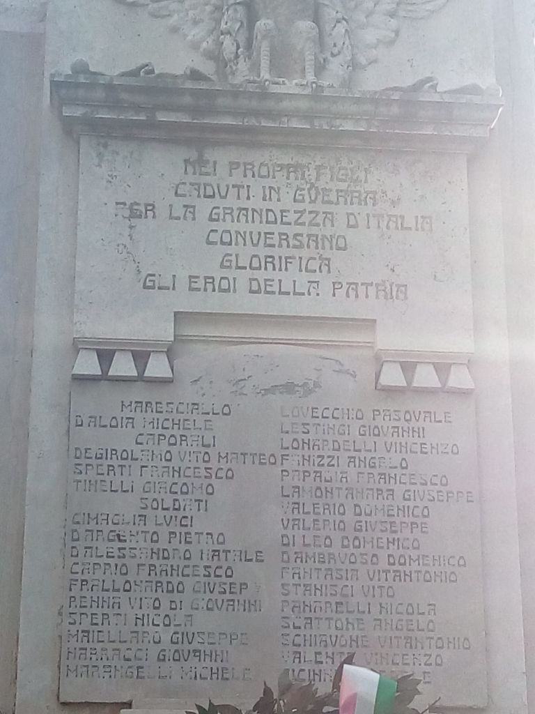 - L'immagine è una veduta d'insieme del Monumento ai Caduti di Conversano. Ubicato nella zona centrale della città al termine della Villa comunale, il monumento fu concepito come una stele in pietra onoraria denominata col termine "Piramide in travertino", sulla cui sommità svetta una stella e fu realizzato dall'artista pugliese originario di Rutigliano Vitantonio De Bellis, autore di diversi monumenti sul territorio che divenne uno specialista del genere, un'attività fortunata che lo porterà poi a dedicarsi, negli anni '60-'70, al restauro e al reintegro dei suoi stessi monumenti.