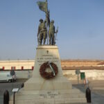 AL LATO DESTRO DEL MONUMENTO, AL DI SOPRA DELLA DICITURA "CADUTI IN LIBIA"CI SONO DUE FUCILI IN BRONZO INCROCIATI E POGGIATI SU DUE BANDIERE SORMONTATE DA UN RAMO QUERCIA E UN ELMETTO.