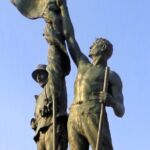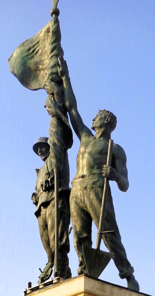 - Il basamento e la piramide tronca sono di marmo bianco di Carrara, mentre le figure maschili del gruppo scultoreo sono in bronzo. Le dimensioni delle figure a misura d'uomo guardano all'orizzonte come a vedere un mondo che risorge dalle rovine della guerra , un futuro senza più guerre. 4 enormi ogive di bombe della seconda guerra mondiale sono poste ai quattro angoli del monumento.