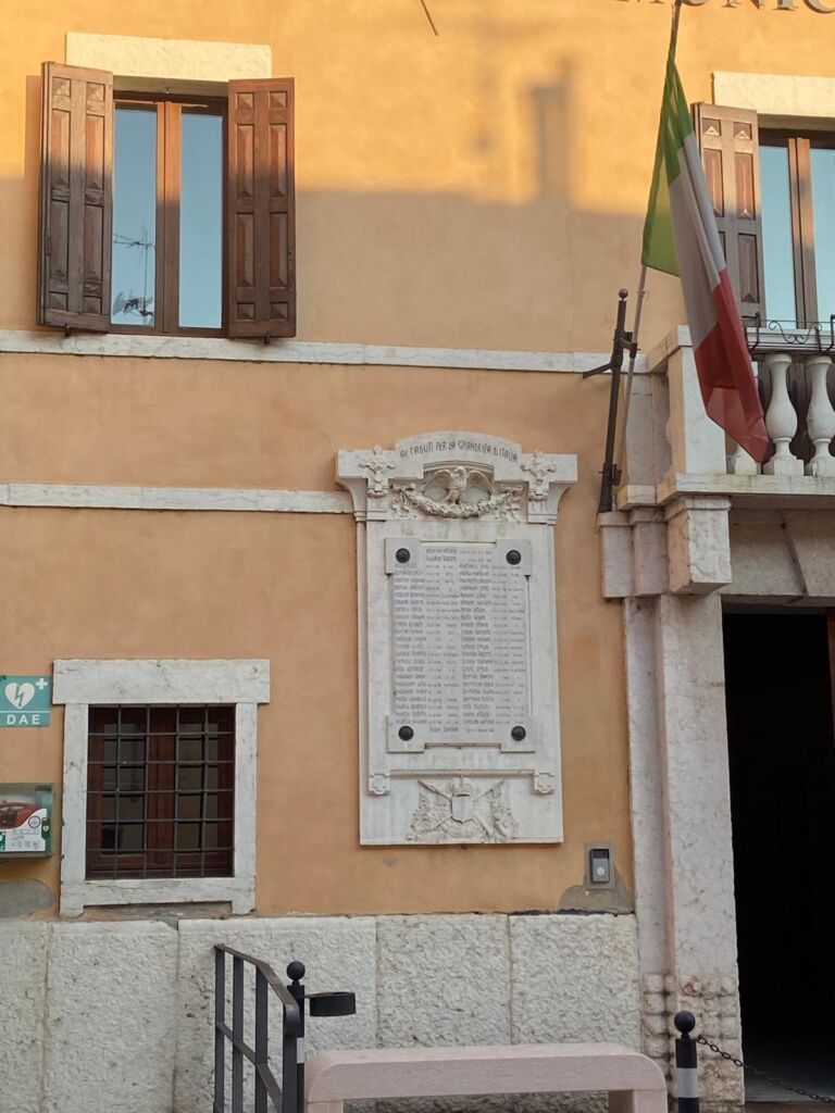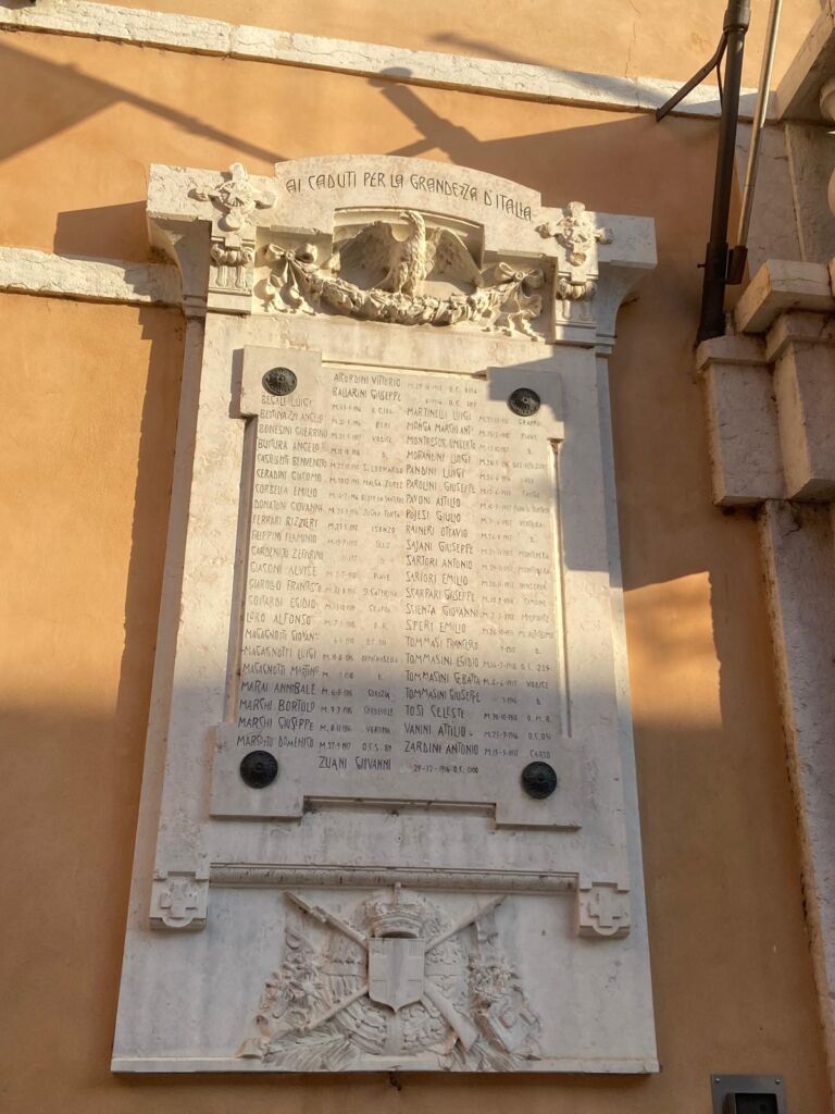 - La lapide fu voluta dal capitano Ettore Tommasini, il quale l’aveva proposta nel 1916 mentre si trovava al fronte. È stata inaugurata il 6 giugno 1920 dal sindaco Ferrante Capetti.