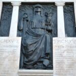 - Il monumento è una composizione con un grande lapide di marmo bianco e con un bassorilievo in bronzo.