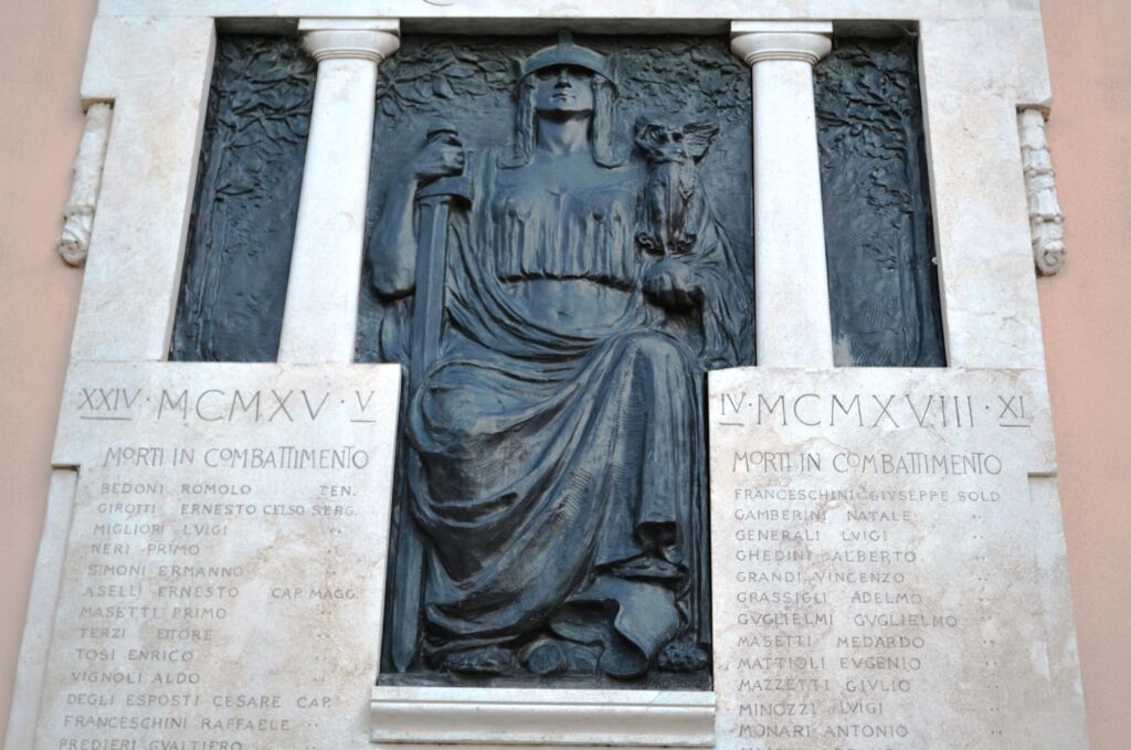Nella parte centrale è posizionata un rilievo in bronzo (opera di Alfonso Borghesani) che appare da una apertura colonnata del marmo come affacciata a una finestra. Si tratta di una figura femminile, seminuda in posizione seduta, che indossa un elmo e impugna nella mano destra un gladio mentre nella mano sinistra sorregge una statuetta della vittoria alata.
