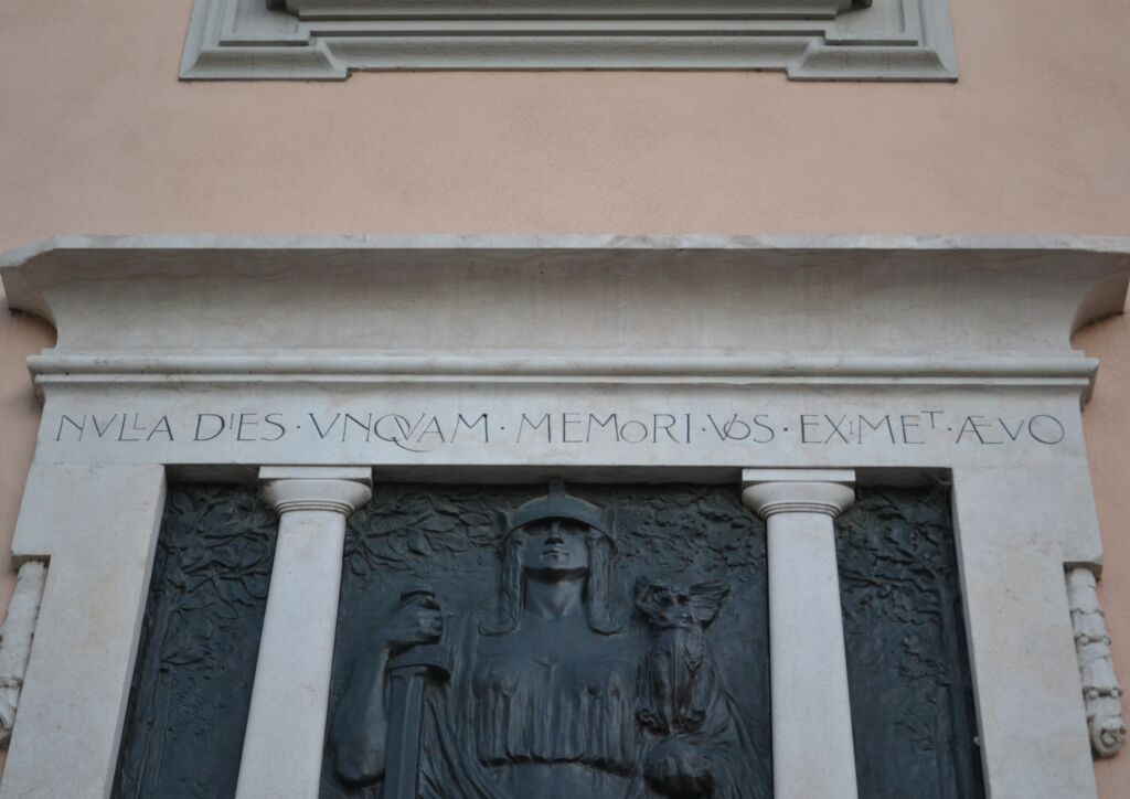 La frase in testa alla lapide è la citazione (con un errore) dal IX Libro dell'Eneide di Virgilio: “Nulla dies umquam memori vos eximet aevo”, (Nessun giorno potrà cancellarvi dalla memoria del tempo).