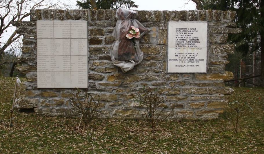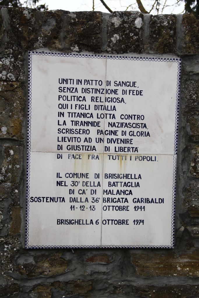 Uniti in patto di sangue, senza distinzione di fede politica religiosa. Qui i figli d’Italia in titanica lotta contro la tirannide nazifascista scrissero pagine di gloria lievito ad un divenire di giustizia di libertà di pace fra tutti i popoli. Il comune di Brisighelal nel 30’ della battaglia di Cà Di Malanca sostenuta dalla 36^ brigata Garibaldi 11-12-13 Ottobre 1941.