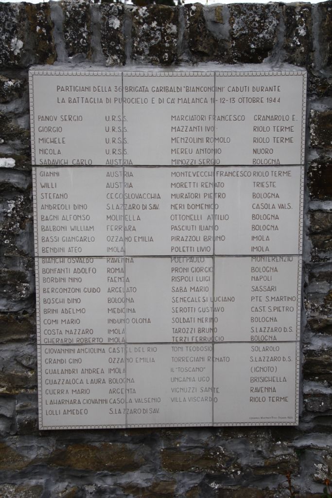 - L’ 11/12/13 Ottobre 1944, a Purocielo e a Cà di Malanca si combatte un’aspra battaglia fra partigiani e forze nazifasciste. Qui si ricordano i nomi dei caduti.