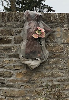 - Due lastre in ceramica, una terracotta fissate su un muro di sassi e laterizi.