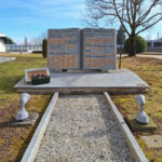 Un vialetto in ghiaia conduce al basamento rialzato e inclinato su cui sono posti: al centro un grande libro aperto con le iscrizioni e le targhette individuali a forma di cartiglio; sull’angolo anteriore sinistro un supporto con la targa rettangolare che riporta una frase di Carlo Delcroix; e sull’angolo posteriore destro l’asta portabandiera. Ai lati del vialetto, due faretti a terra garantiscono l’illuminazione notturna.