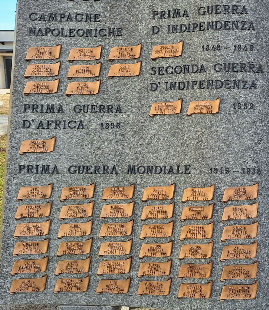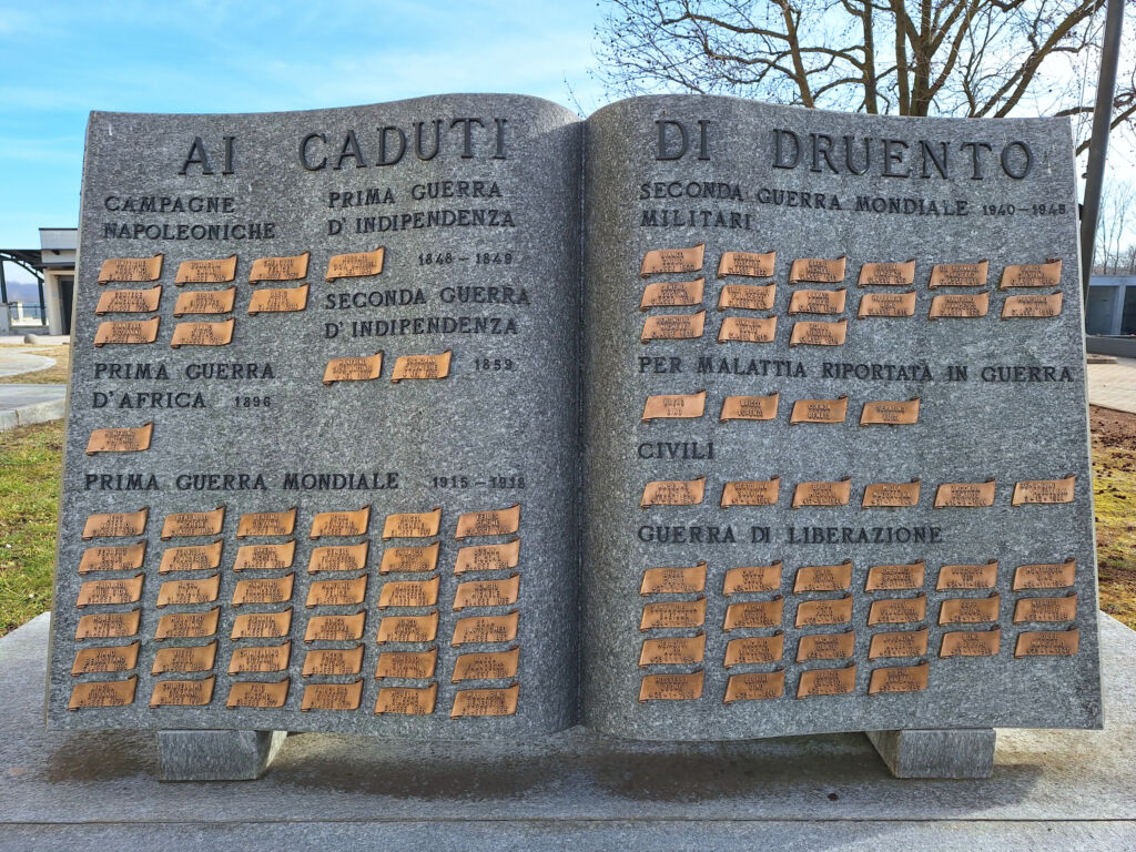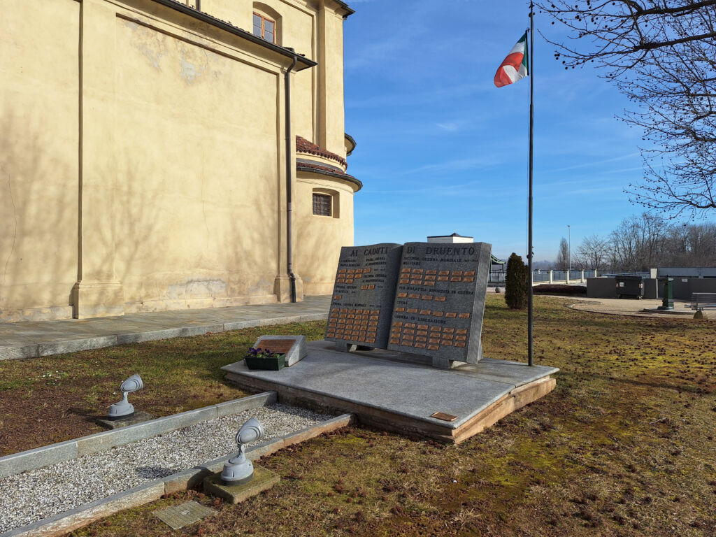 Il moderno monumento in granito con lettere in bronzo e targhe in ottone, dedicato ai Caduti di Druento in tutte le guerre, è collocato di fianco alla chiesa di Santa Maria della Stella, nel cimitero comunale, al margine dell’abitato rivolto verso il parco della Mandria.