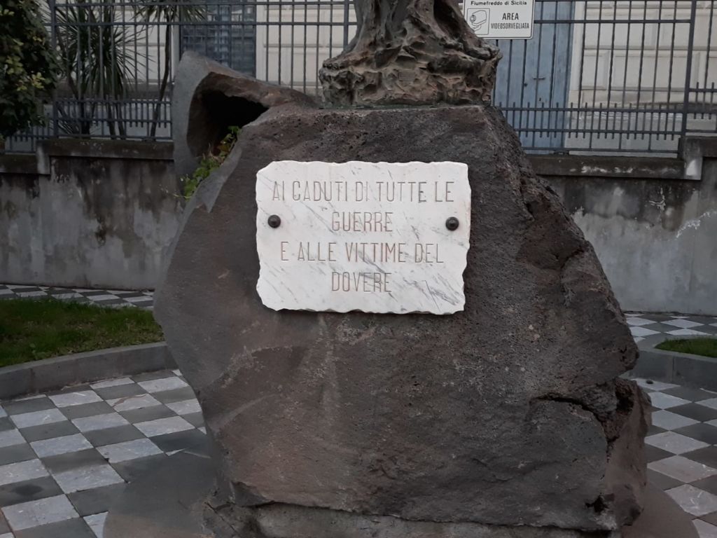 Il monumento ricorda i Caduti di Fiumefreddo di Sicilia nella prima e seconda guerra mondiale. Si trova in una piazza (lungo via Gramsci) dal pavimento lastricato a scacchiera. Il gruppo scultoreo poggia su di un basamento in pietra all’interno di una piccola zona delimitata. Le quattro figure rappresentano due uomini, una donna con in grembo due bimbi di cui uno sarebbe ancora dovuto nascere.