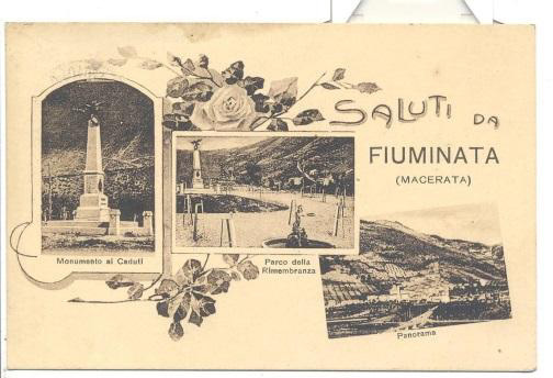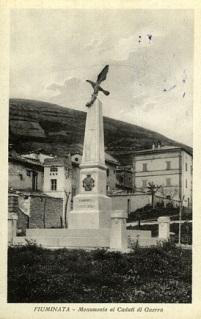 - Il monumento, costruito nel primo dopoguerra, non è costituito solamente dall’obelisco. Infatti, nell’intero parco sono stati piantati nello stesso periodo tanti tigli quanti i fiuminatesi caduti nella prima guerra mondiale. Negli anni Venti, famiglie parenti e amici dei Caduti portavano loro foto su ogni albero, dove piangevano il ragazzo perso in guerra. Intorno all’obelisco abbiamo quattro colonne, unite da una catena. Sulla parte che guarda l’intero parco c’è lo stemma del comune di Fiuminata, in bronzo. Sotto lo stemma c’è una targa posta dopo le due guerre che ricorda due carabinieri di Fiuminata caduti in servizio. Ogni anno vengono piantati fiori per abbellire il monumento e le cerimonie, come quella del 25 aprile o del 4 novembre, vengono svolte nel parco, con partecipazione della popolazione, delle autorità civili, militari e religiose del luogo, dei rappresentanti delle istituzioni scolastiche e della banda. In cima all’obelisco c’è un’aquila in bronzo rivolta verso Roma. Su tutti e quattro i lati dell’obelisco c’è un elenco di nomi dei Caduti nelle due guerre, che tuttavia si sono rovinati e sono ormai poco leggibili. Sul lato destro viene elencato anche il grado rivestito dai militari.