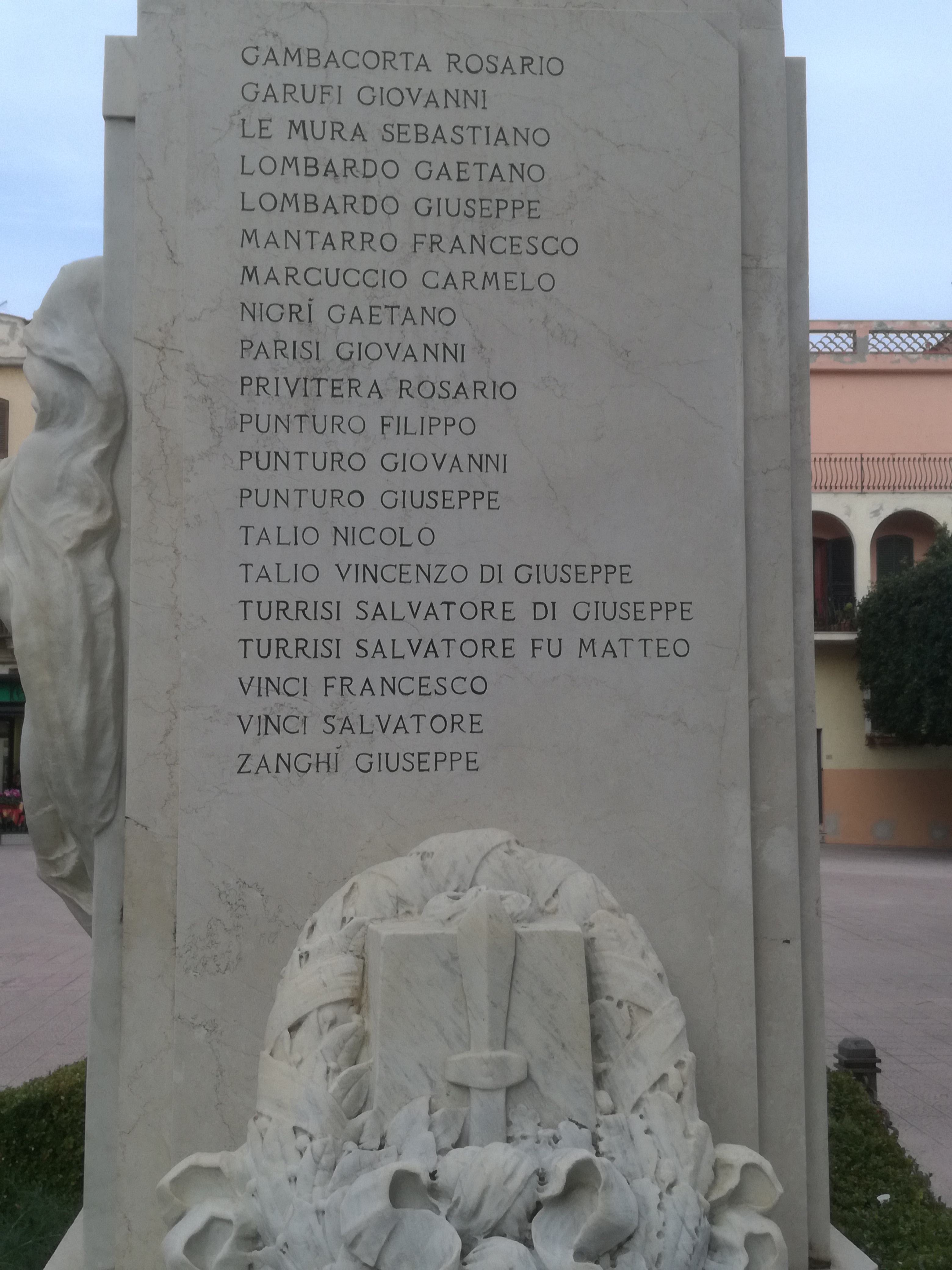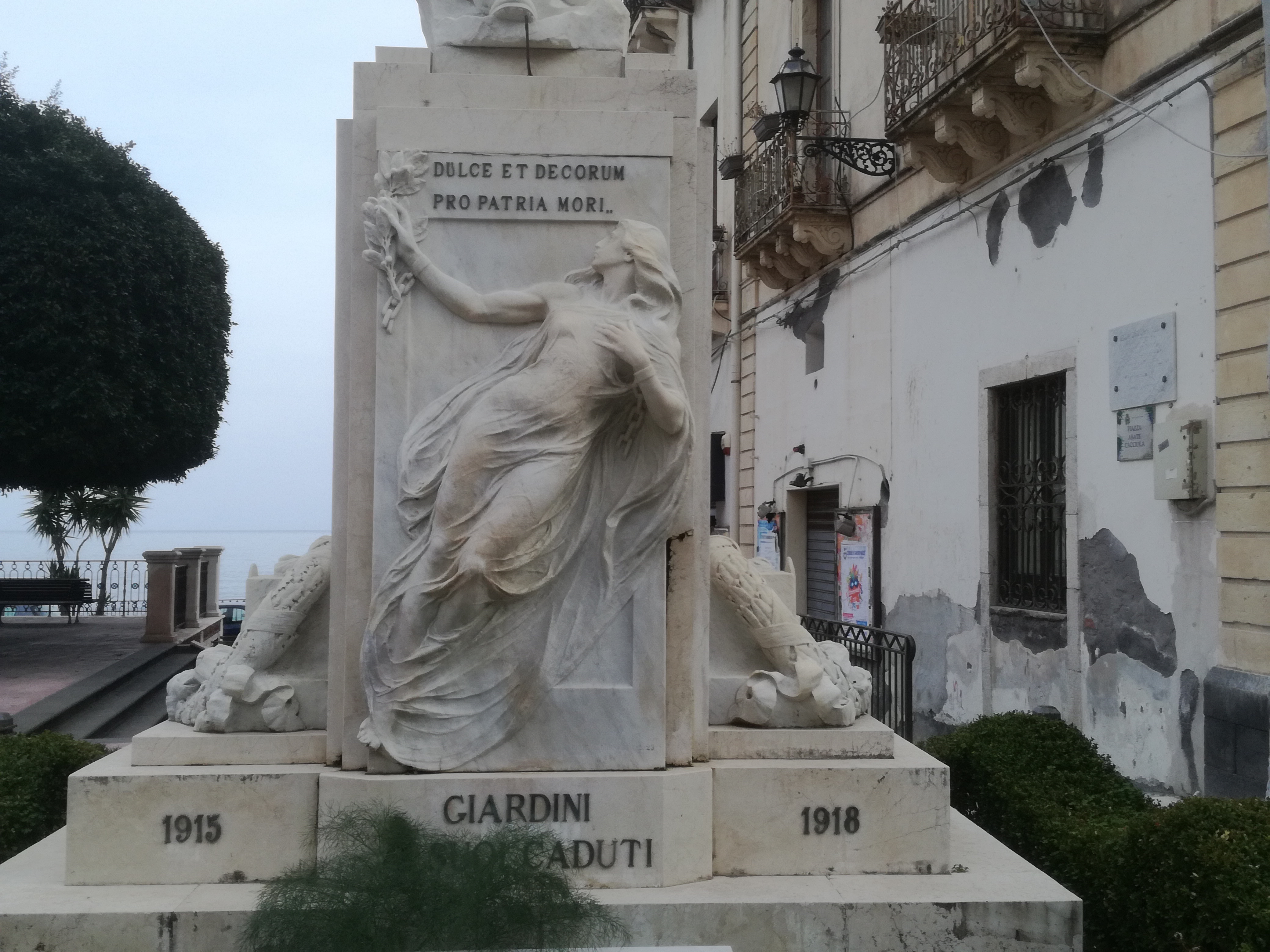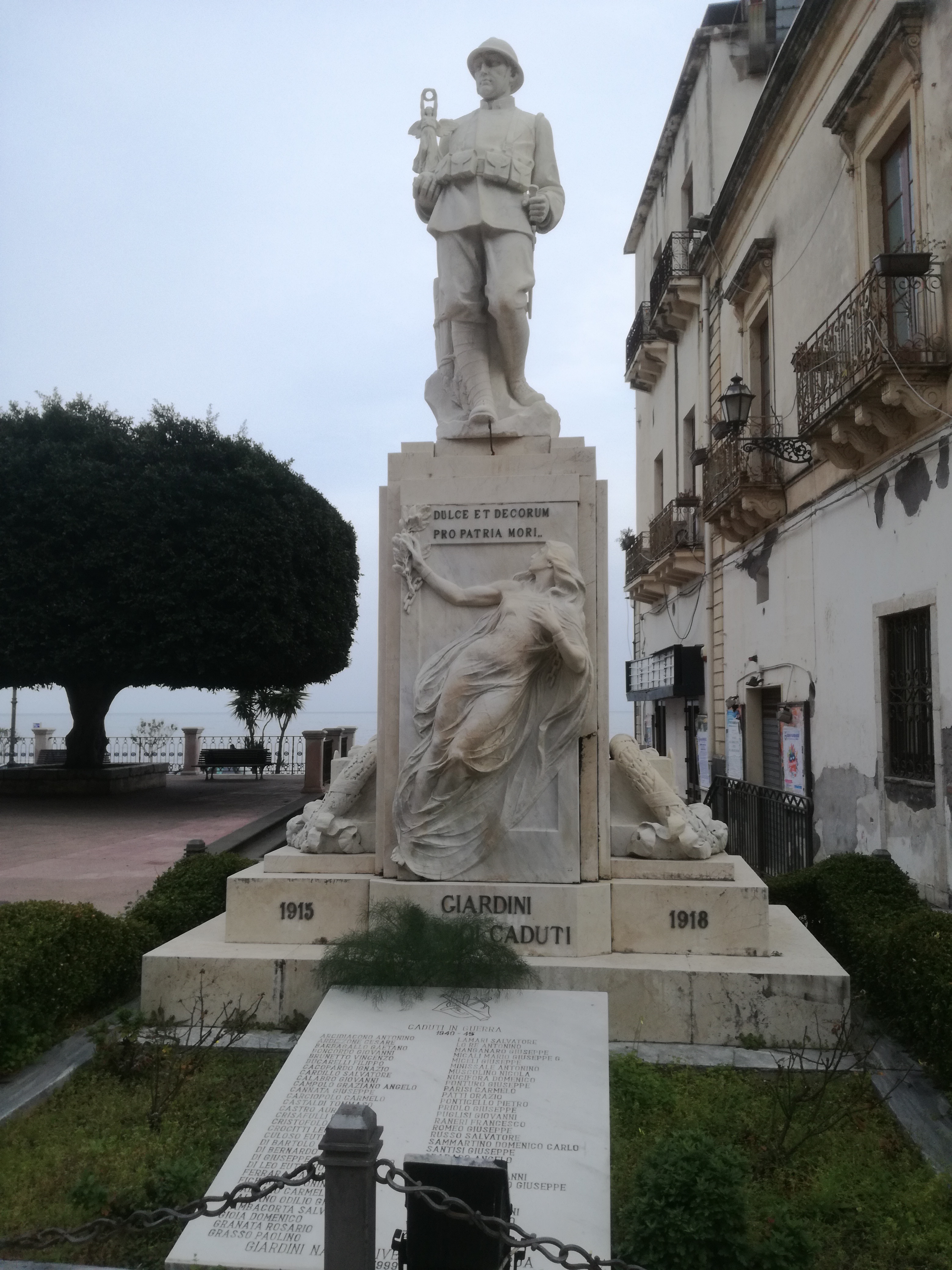 Il 14 aprile del 1919, il Consiglio Comunale di Giardini destinava la somma di 3.000 lire per l’erezione del monumento quale <>. Precedentemente, il primo giugno dello stesso anno nella Chiesa Madre del centro ionico era stata inaugurata una lapide ai caduti della guerra. Lo stanziamento per il monumento fu confermato il 25 maggio dell’anno successivo. Inoltre, c'è testimonianza che il Comitato per l'erezione del Monumento avesse fatto richiesta che il Comune imponesse un sovraprezzo di £2 a quintale sulla vendita del frumento, per accelerare la raccolta della somma. La proposta considerata "altamente patriottica" fu approvata e avrebbe avuto la durata di sei mesi a partire dal primo febbraio del 1920.