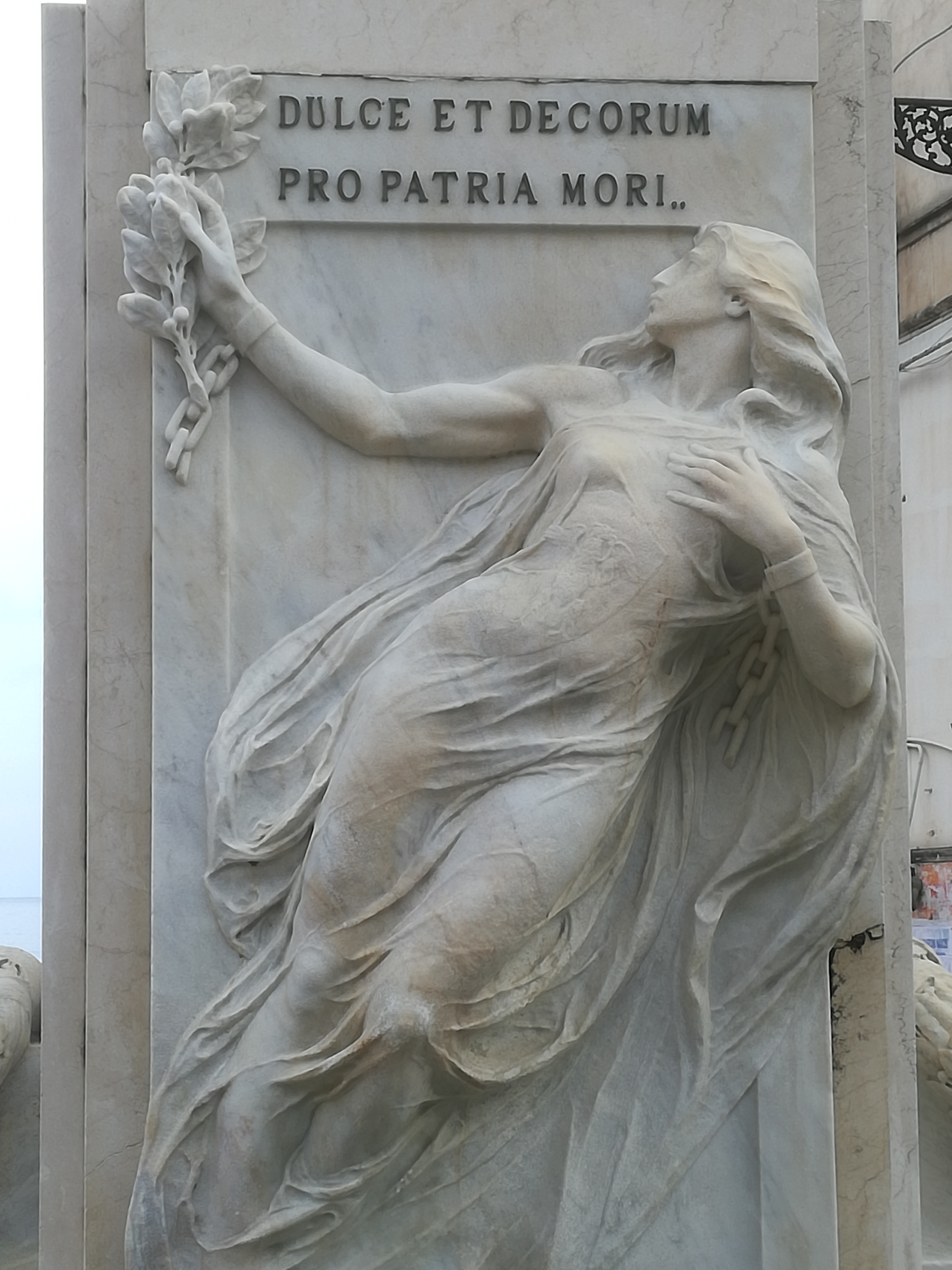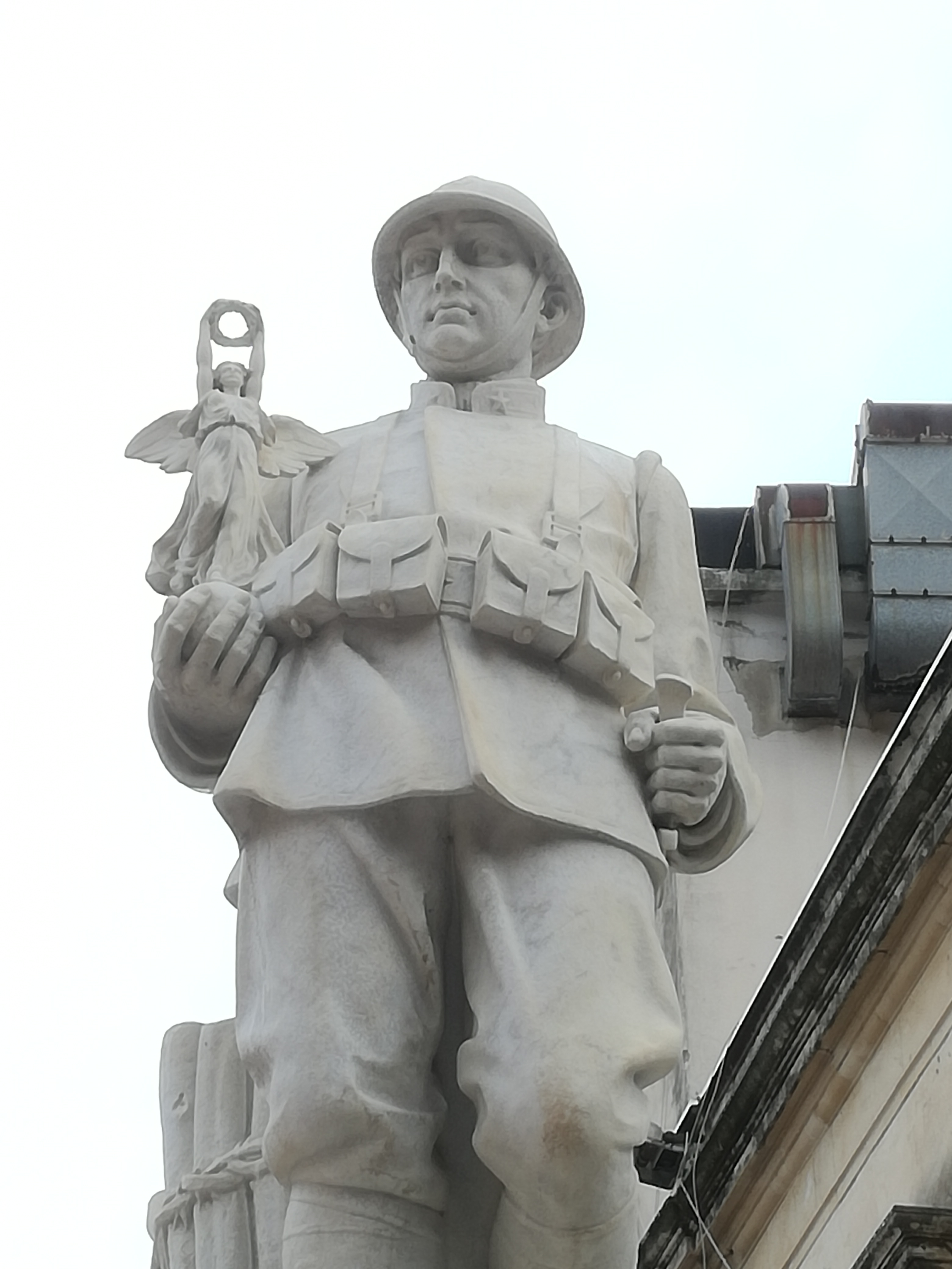 Il soldato stringe in ognuna delle sue mani: Vittoria alata e baionetta, la gloria ottenuta con sangue e combattimento.