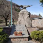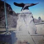 un masso in pietra con in cima un'aquila e di fronte una lastra con la dedica