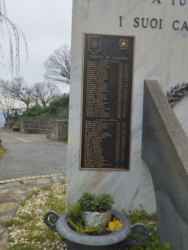 IL MONUMENTO QUI ERETTO/TESTIMONIA UN GRANDE AFFETTO/DEDICATO D'ORA IN POI/DA MALVAGNA AI SUOI EROI,/CHE DONARONO LA VITA/PER LA NOSTRA ITALIA UNITA./SONO I NOSTRI COMBATTENTI/QUASI TUTTI A NOI PARENTI/CHE HANNO UN POSTO NELLA STORIA/E TANTA,TANTA GLORIA./ ACCANTO A QUESTA ARA, /VIVO E'IL SUON DELLA FANFARA,/CHE CI PORTA IN UN MOMENTO/NELL'ASPROCOMBATTIMENTO./SONO I PROTAGONISTI/DI DUE GUERRE MOLTO TRISTI,/DURI SCONTRI COMBATTUTI/ E DA EROI POI CADUTI./CON UN GRANDE AUSPICIO/POSSA IL LORO SACRIFICIO/CONSERVARE IN OGNI ETA'/LA SOSPIRATA LIBERTA'/DA TEMPO LORO DORMONO IN PACE/MA PER NOI IL RICORDO,/QUI SEMPRE GIACE./