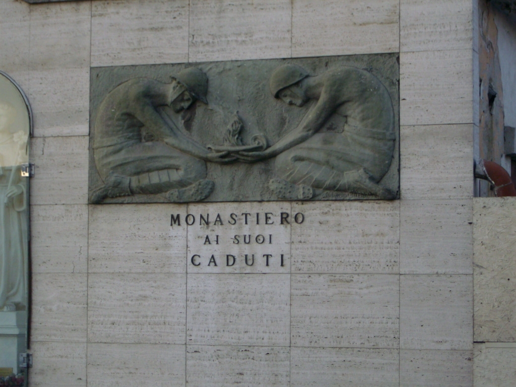Vi è un rilievo in marmo che raffigura due combattenti delle due Guerre, in ginocchio mentre sorreggono una fiaccola. Opera di Ulisse Salvador.