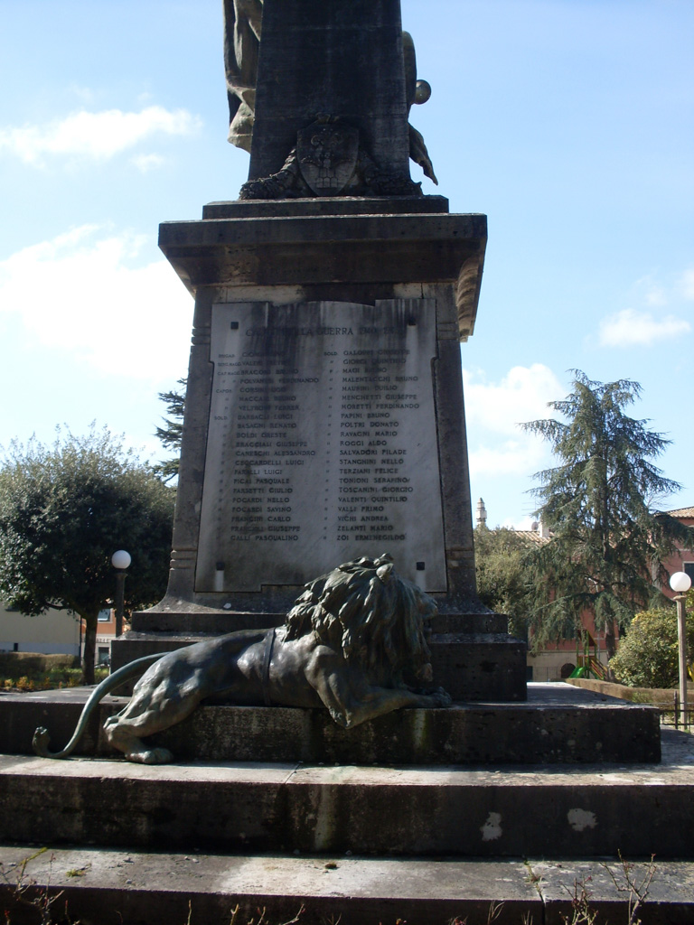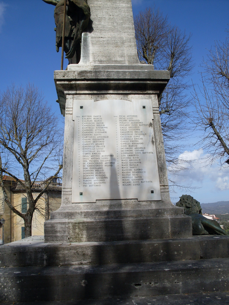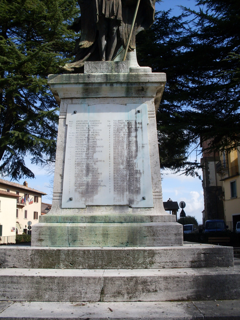 - Il monumento fu realizzato per ricordare i Caduti della guerra 1915 – 1918. Dopo il 1945 fu inserita sul retro del basamento la lapide con i nomi dei Caduti del secondo conflitto mondiale.