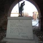 - Basamento di marmo con lastra a trapezio dello stesso materiale. Sopra statua in fusione di bronzo rappresentante una figura femminile con le mani legate.