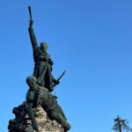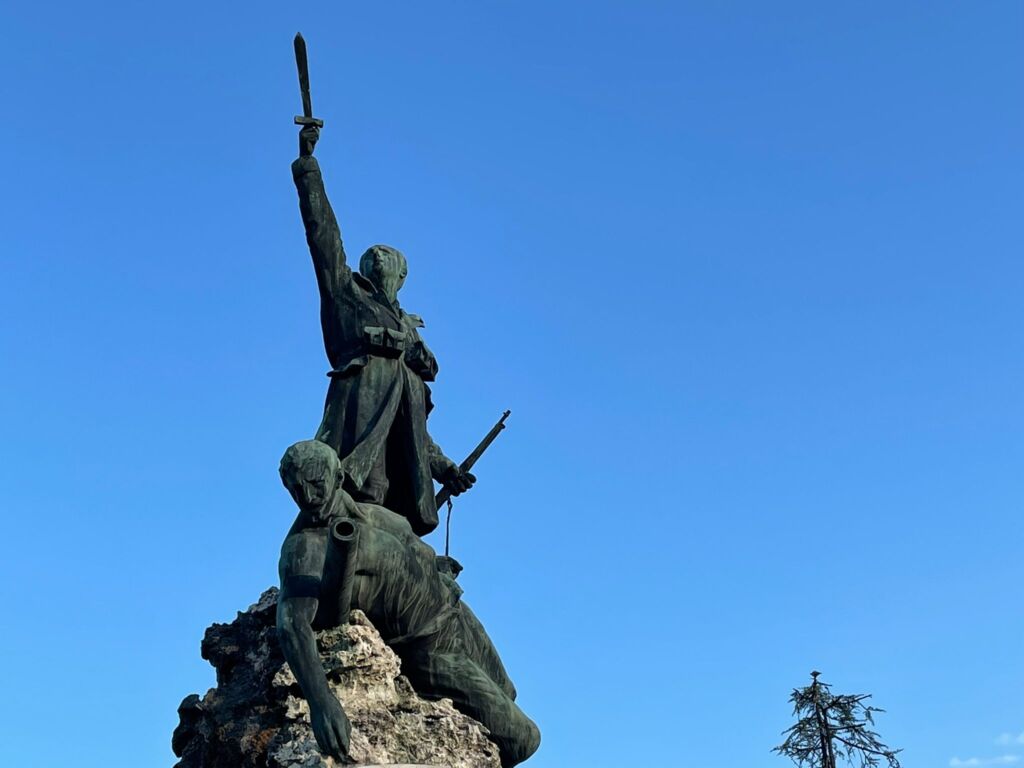 Sopra il monumento centrale soldato (in bronzo) vittorioso, in piedi, con il fucile nella mano sinistra e la destra protesa al cielo con una spada. Sovrasta un Caduto riverso su di un cannone e una ruota a raggi rotta. Nei due obelischi laterali (lontani 20 metri dal monumento centrale, uno a destra e uno a sinistra) arde una fiamma perpetua ed appena sotto, sui quattro lati, sono presenti corone con foglie d'alloro e d'ulivo in bronzo.