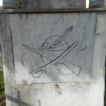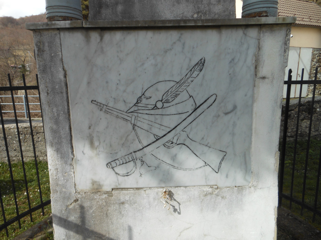 - Un fucile e una spada incrociati ed un cappello di alpino (simboli di guerra). Fregi con foglie di quercia