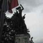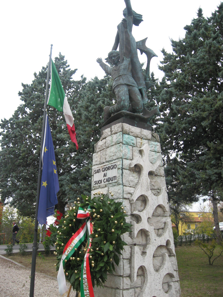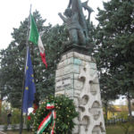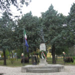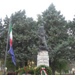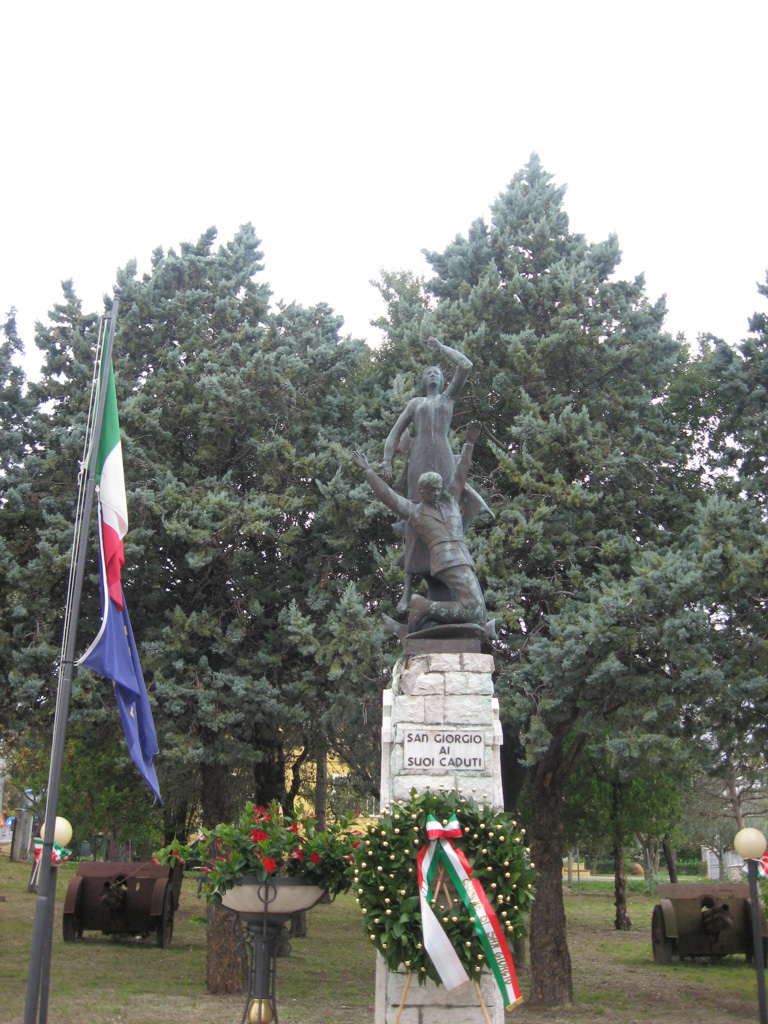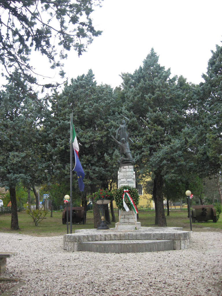 - Base rivestita di pietre sbozzate; statua di donna e soldato in bronzo.