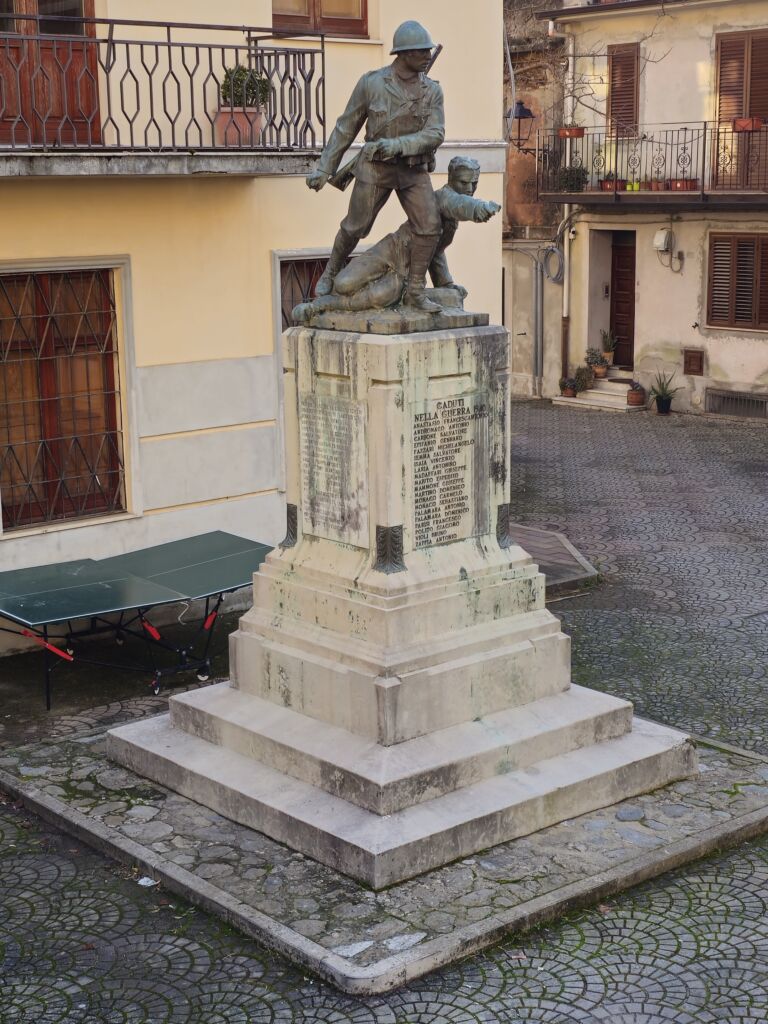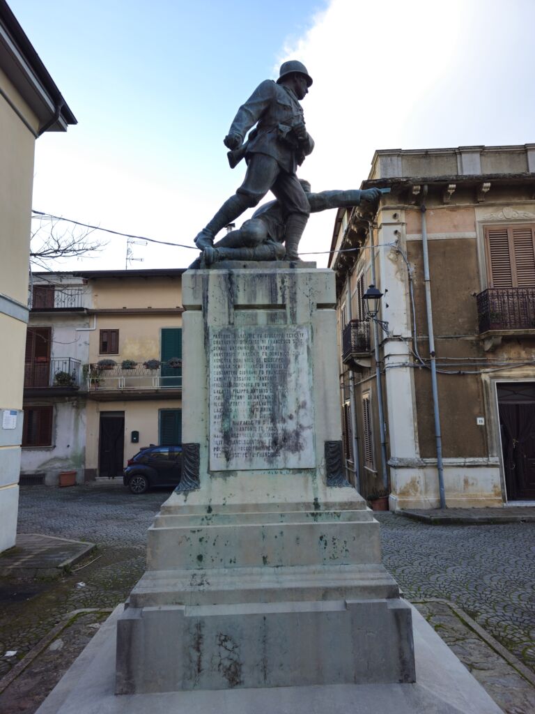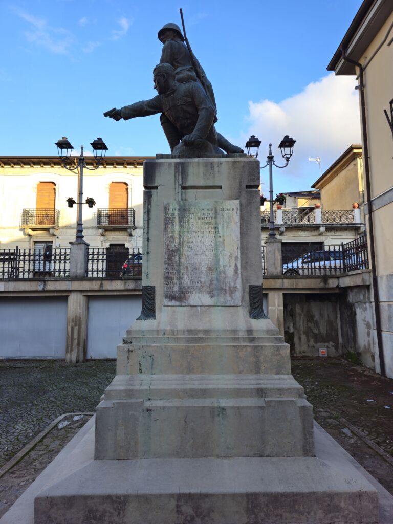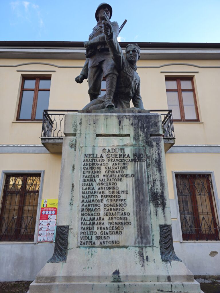 - Il monumento in muratura rivestito in marmo, sui prospetti laterali sono incisi su marmo i nomi di trentanove caduti della prima guerra mondiale e su quello frontale i nomi di venti della seconda; il gruppo scultoreo bronzeo realizzato con la tecnica di fusione.